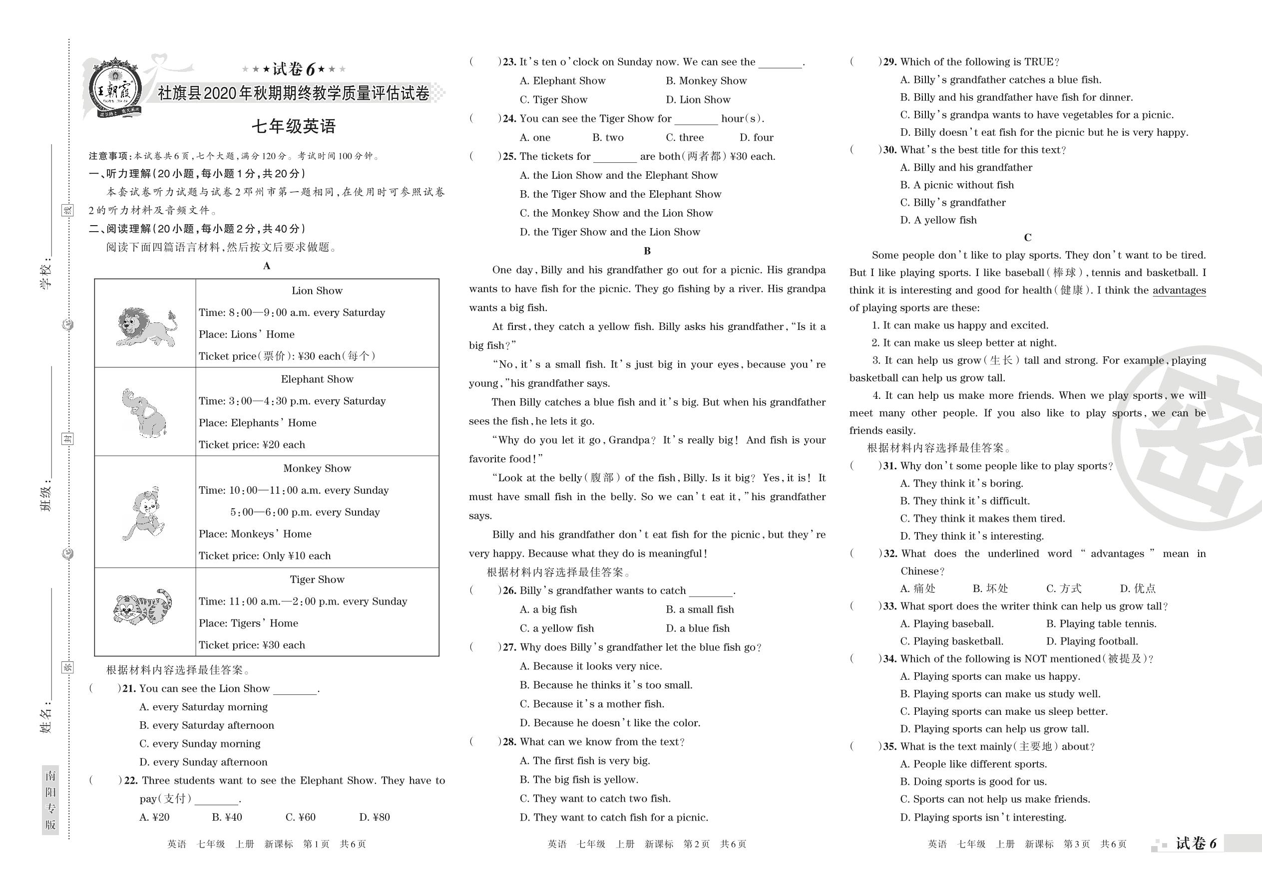 社旗县2020年秋期期终教学质量评估试卷七年级英语(新课标版)【6】