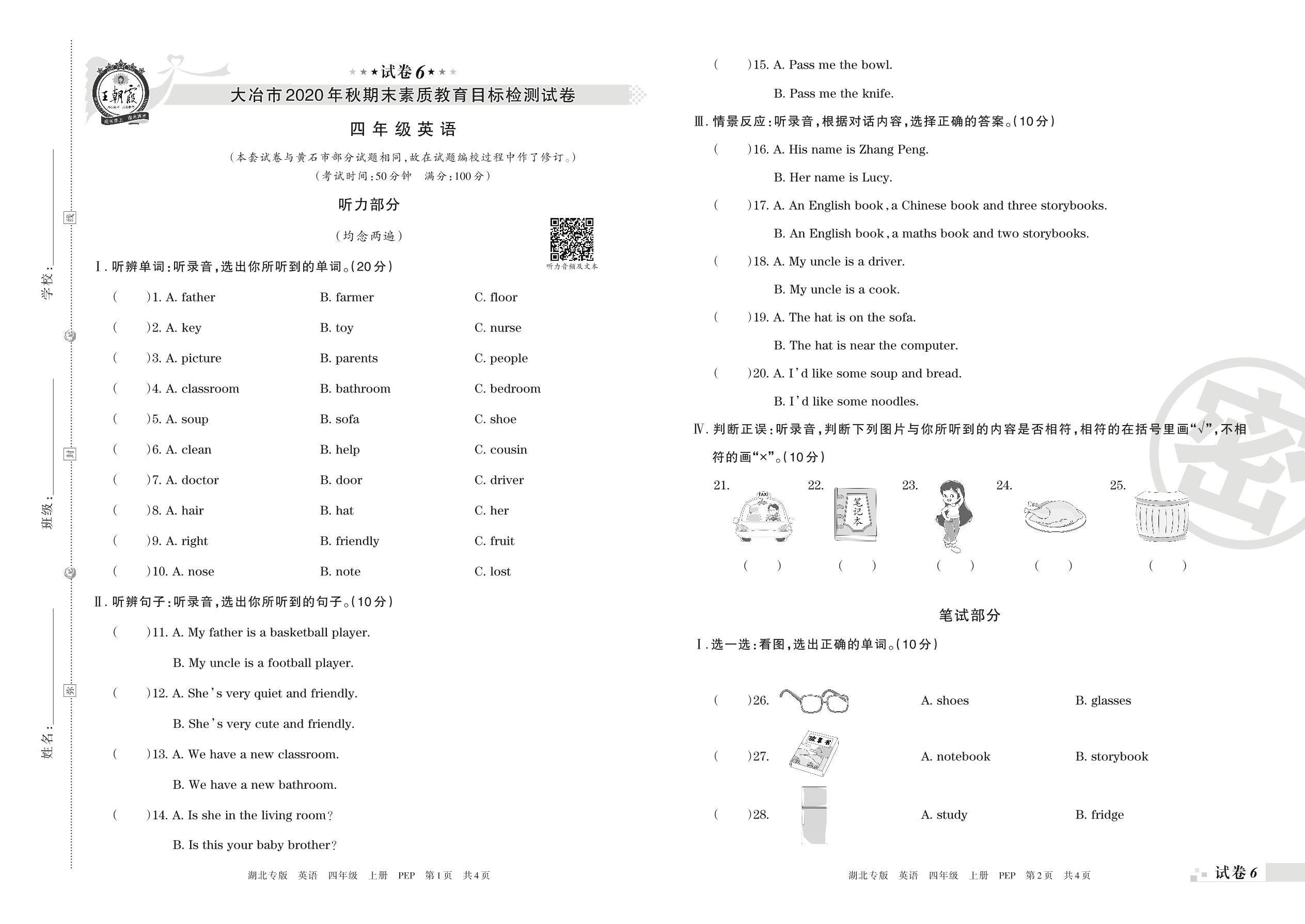 大冶市2020年秋期末素质教育目标检测试卷四年级英语(人教PEP版)【6】