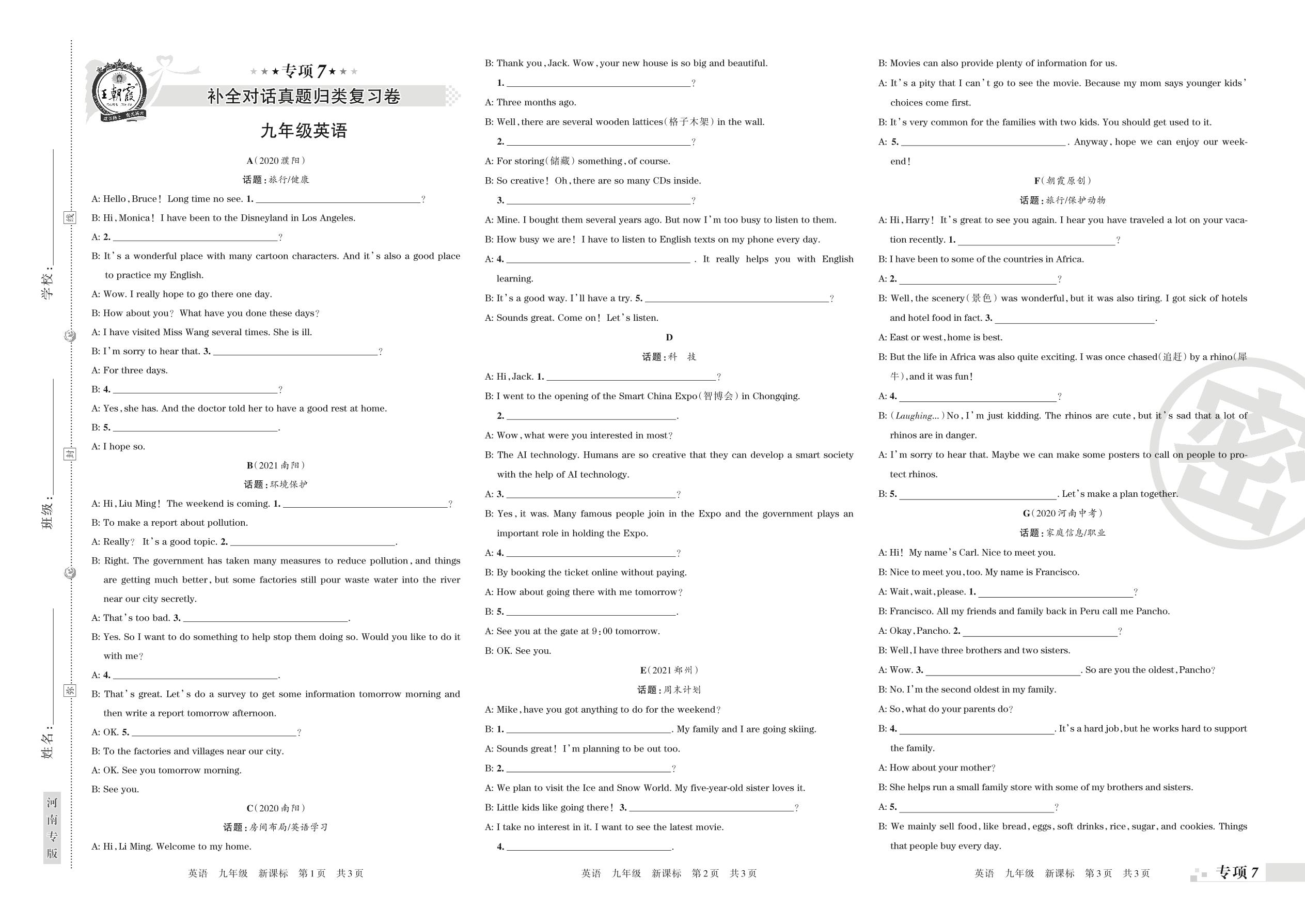 2021-2022学年第一学期王朝霞期末专项卷——补全对话真题归类复习卷九年级英语(新课标版)【7】