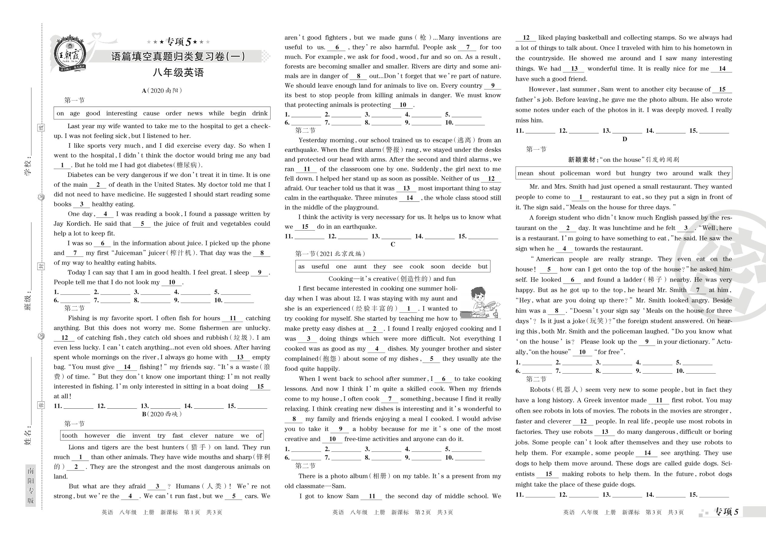 王朝霞期末专项卷——语篇填空真题归类复习卷(一)八年级上册英语(新课标版)【5】