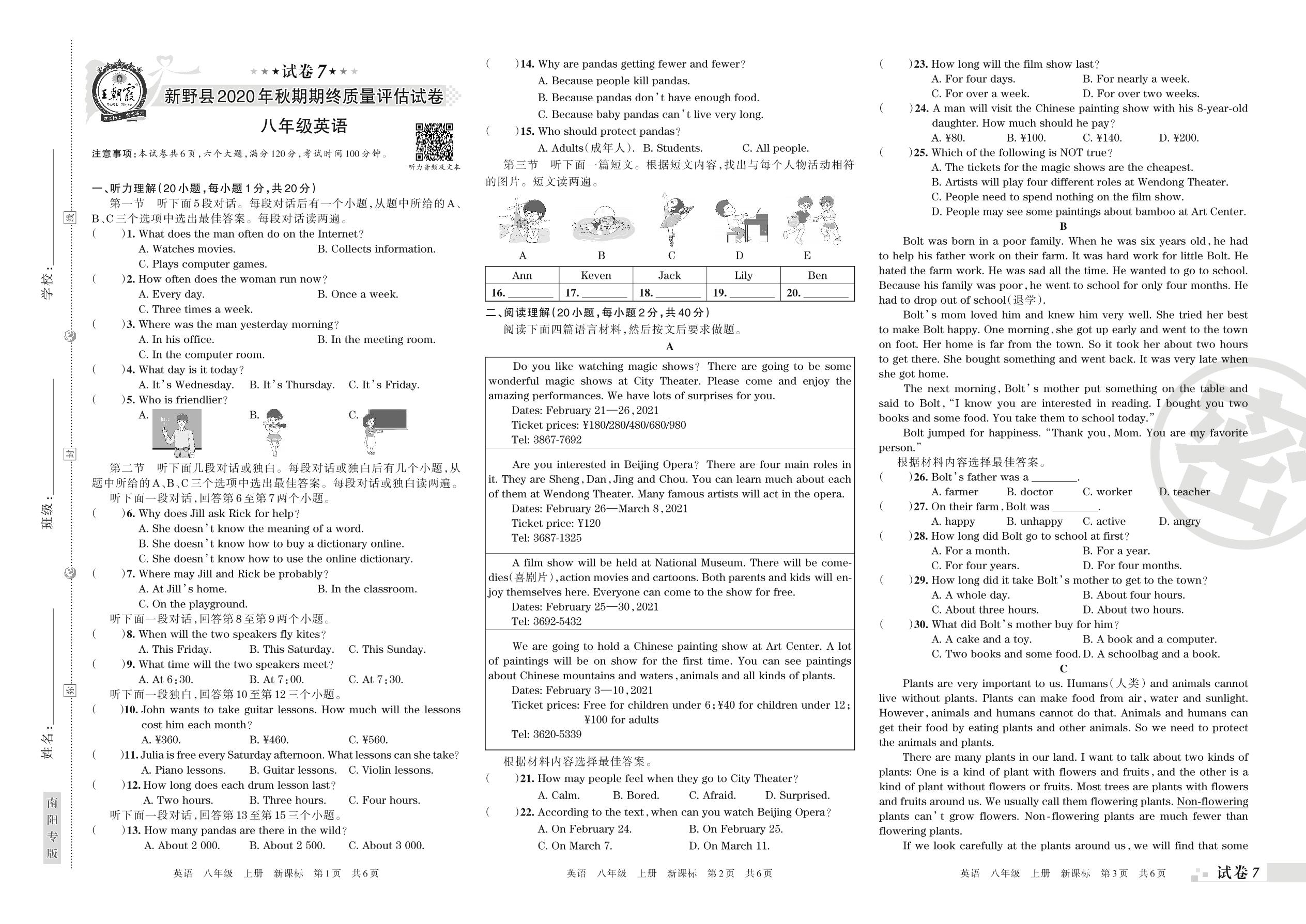 新野县2020年秋期期终质量评估试卷八年级英语(新课标版)【7】