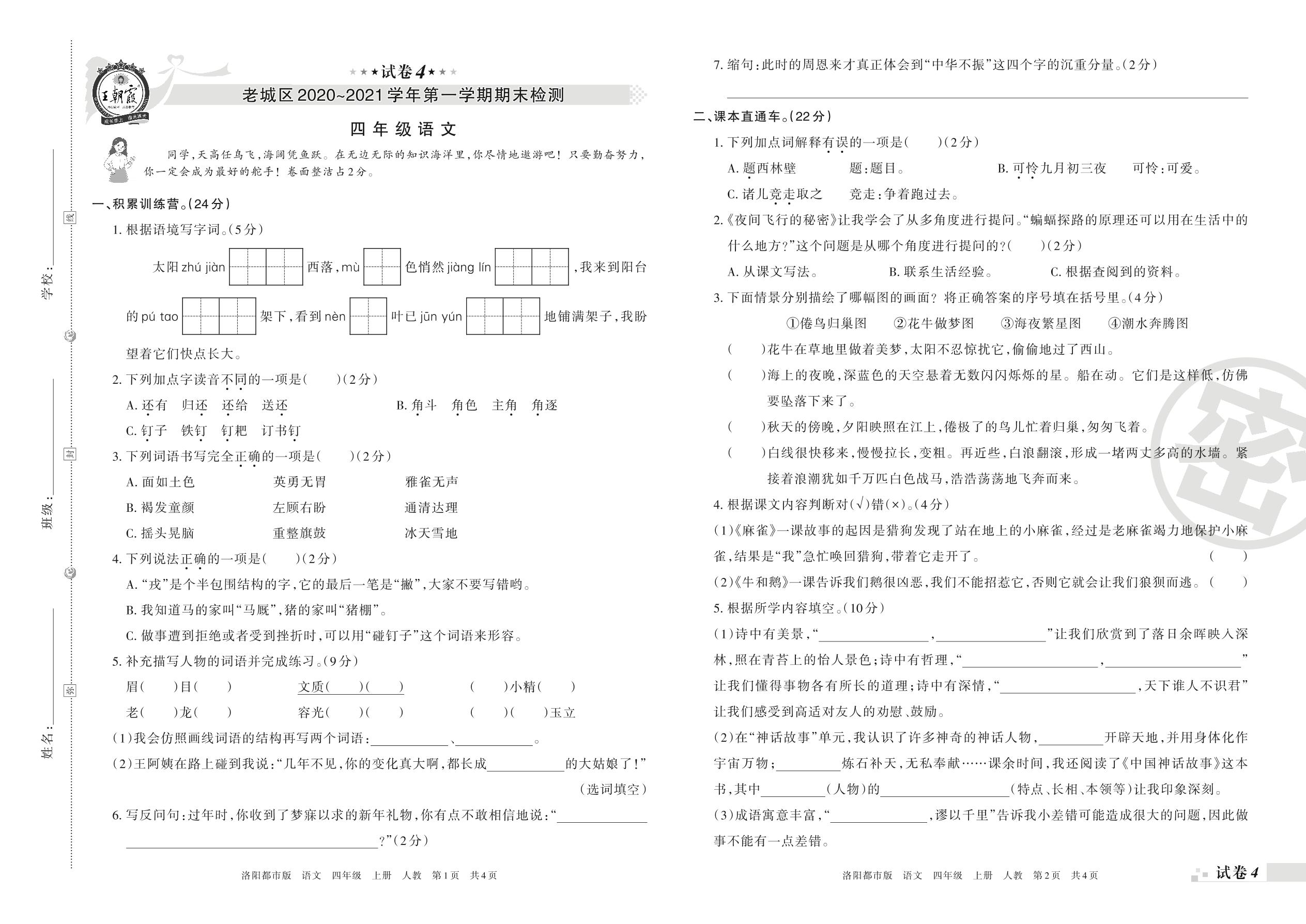 老城区2020~2021学年第一学期期末检测四年级语文(人教版)【4】
