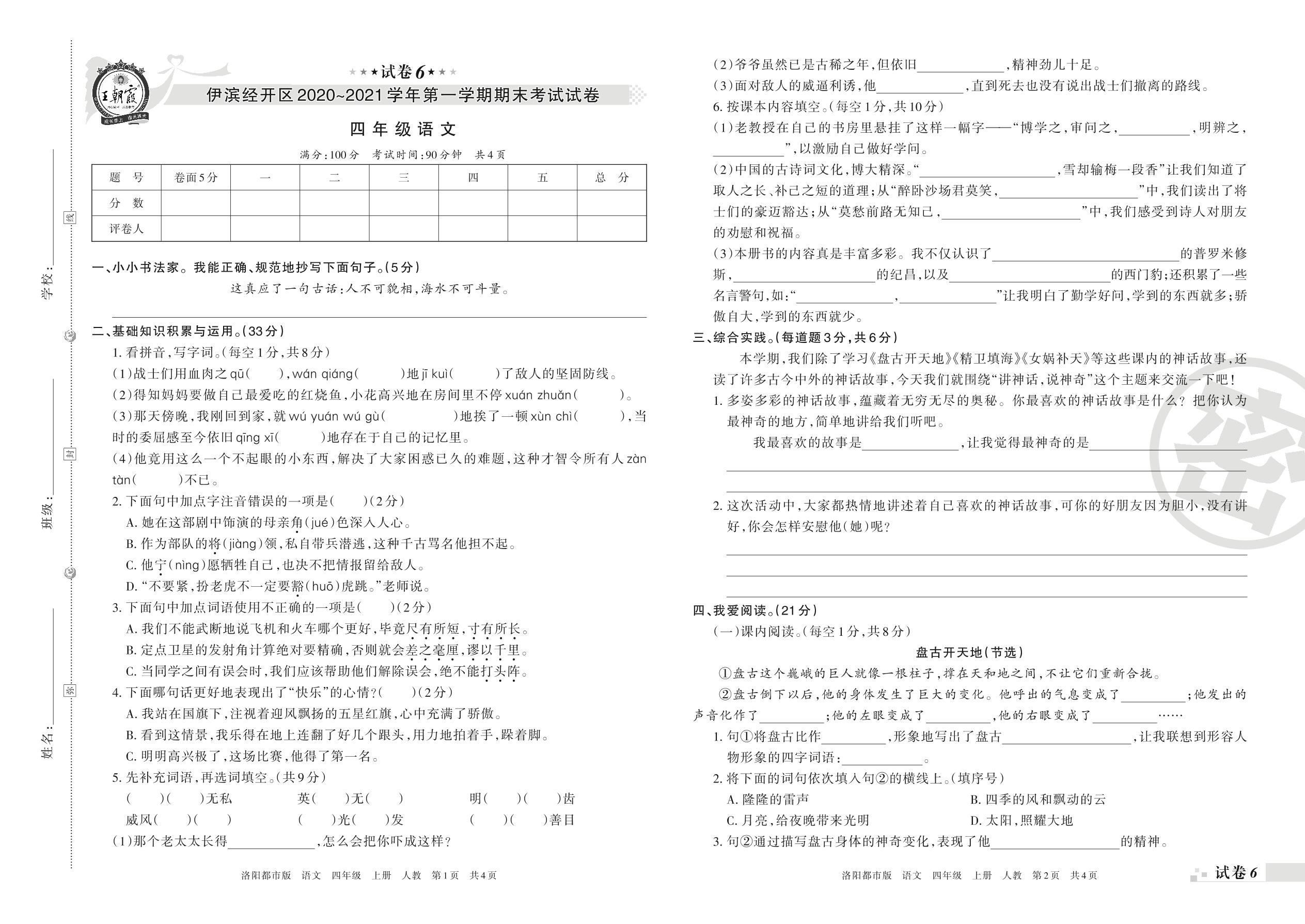 伊滨经开区2020~2021学年第一学期期末考试试卷四年级语文(人教版)【6】