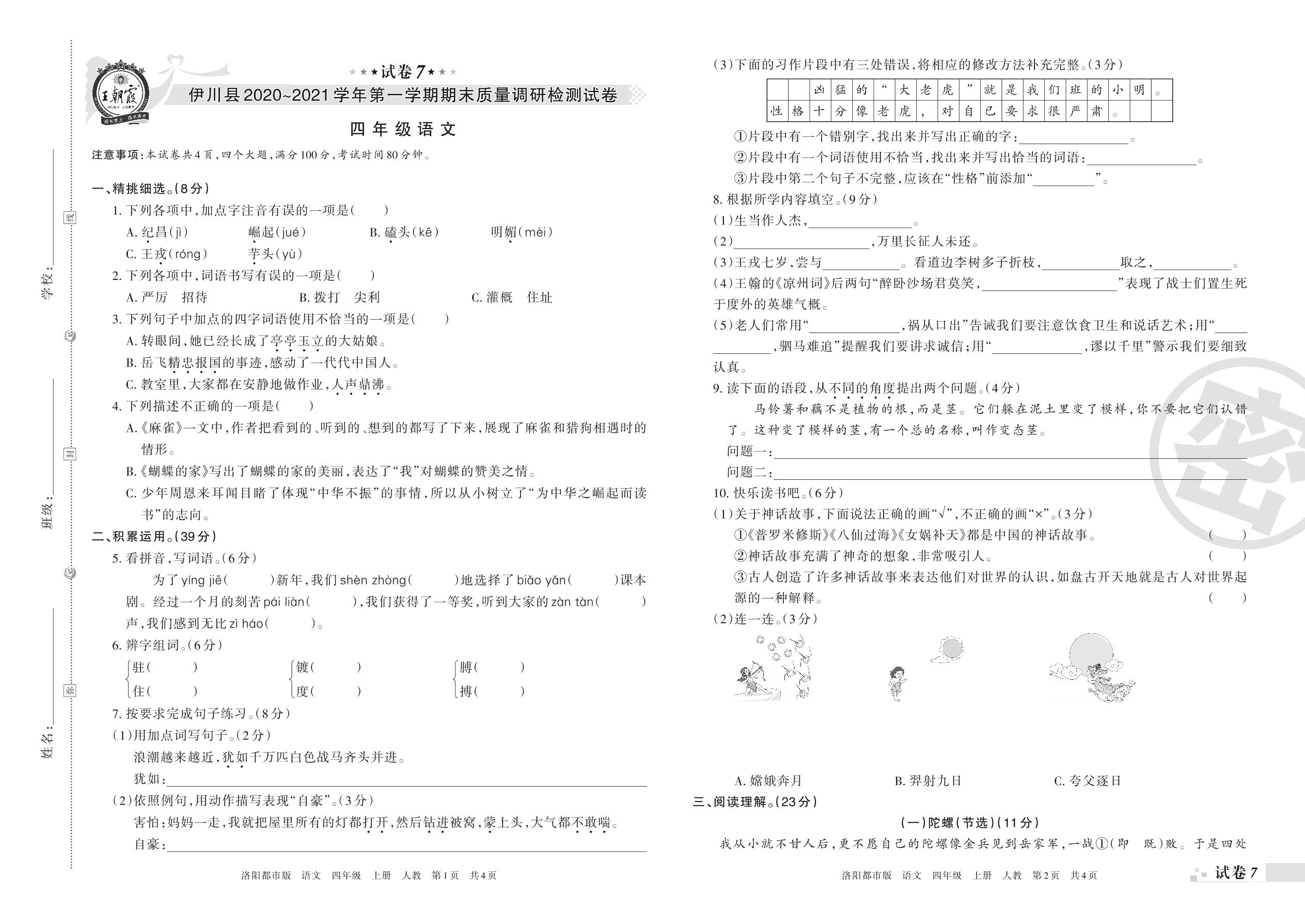 伊川县2020~2021学年第一学期期末质量调研检测试卷四年级语文(人教版)【7】
