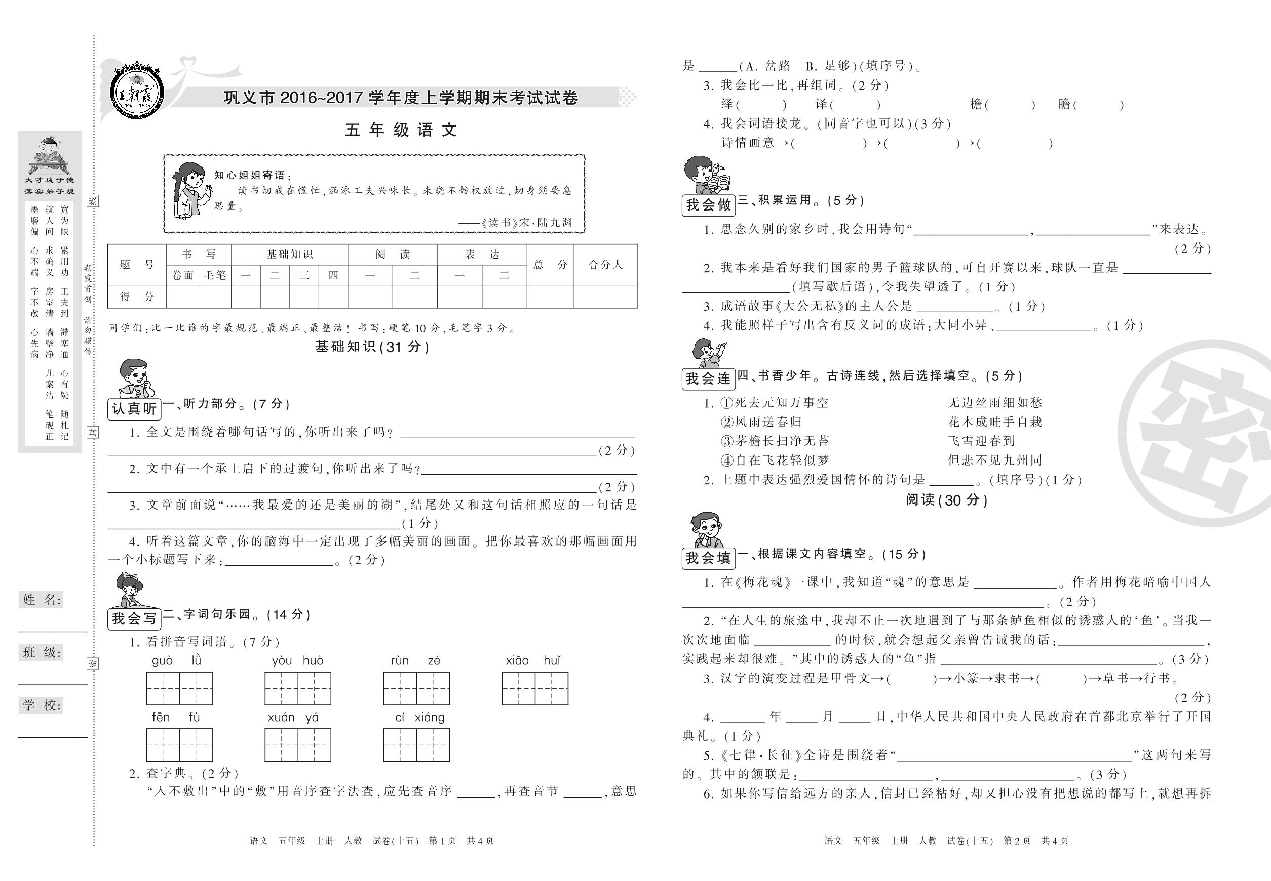 2016-2017学年第一学期巩义市五年级语文试卷(人教版)【15】
