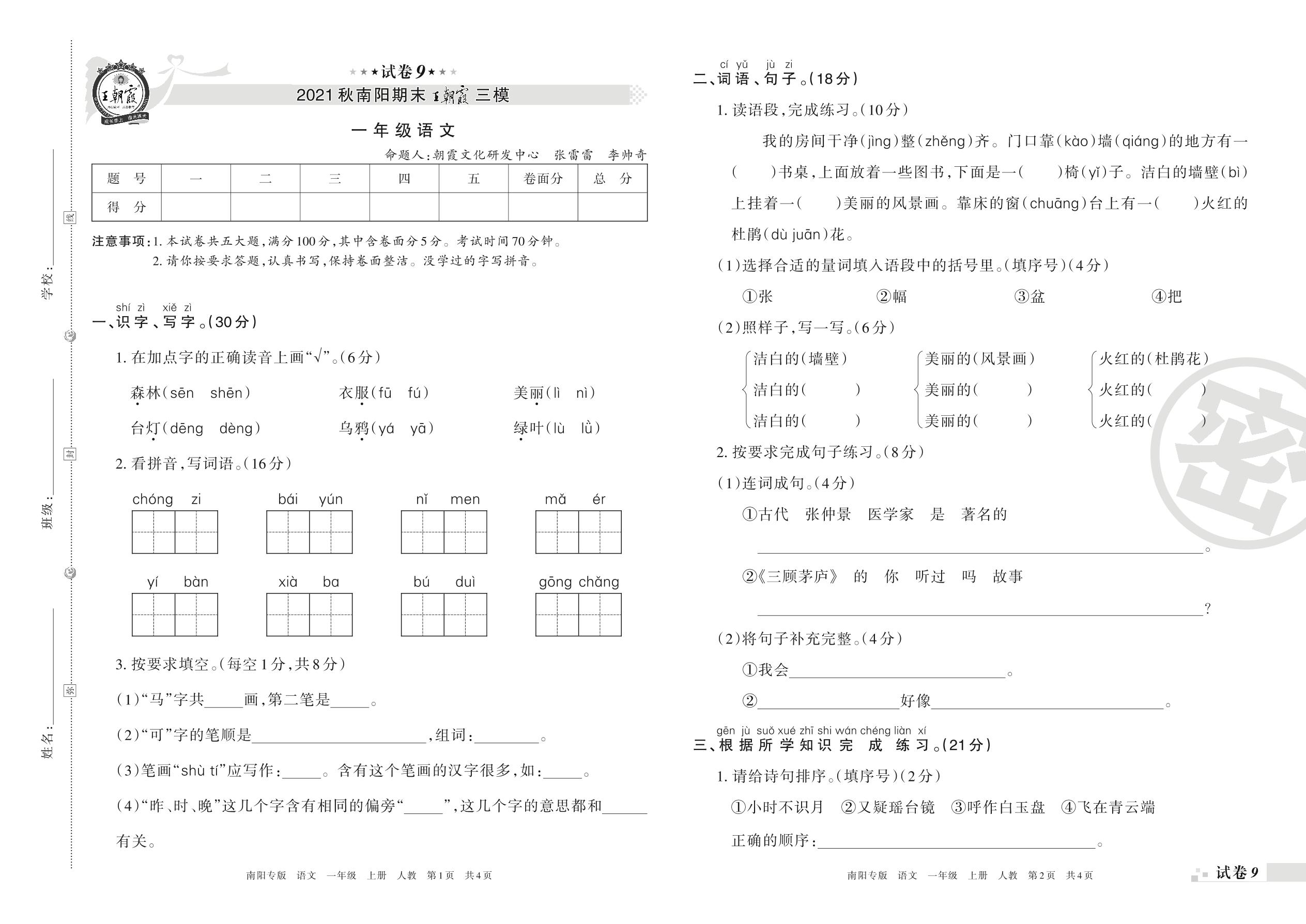 王朝霞期末模拟卷一年级上册语文(人教版)_R211224143732450【9】