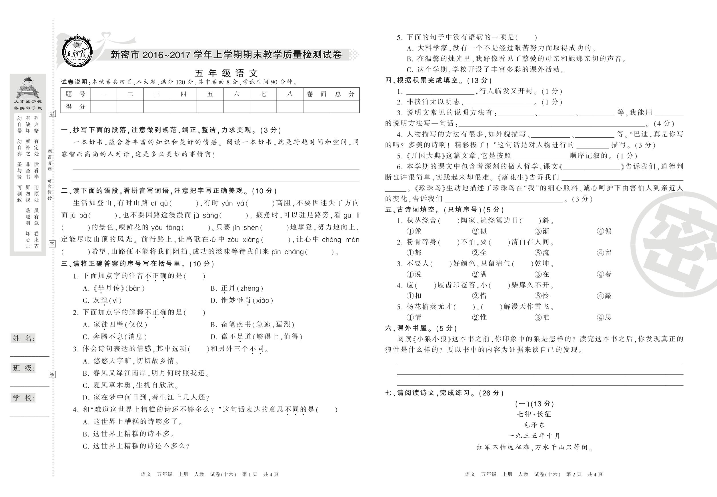 2016-2017学年第一学期新密市五年级语文试卷(人教版)【16】