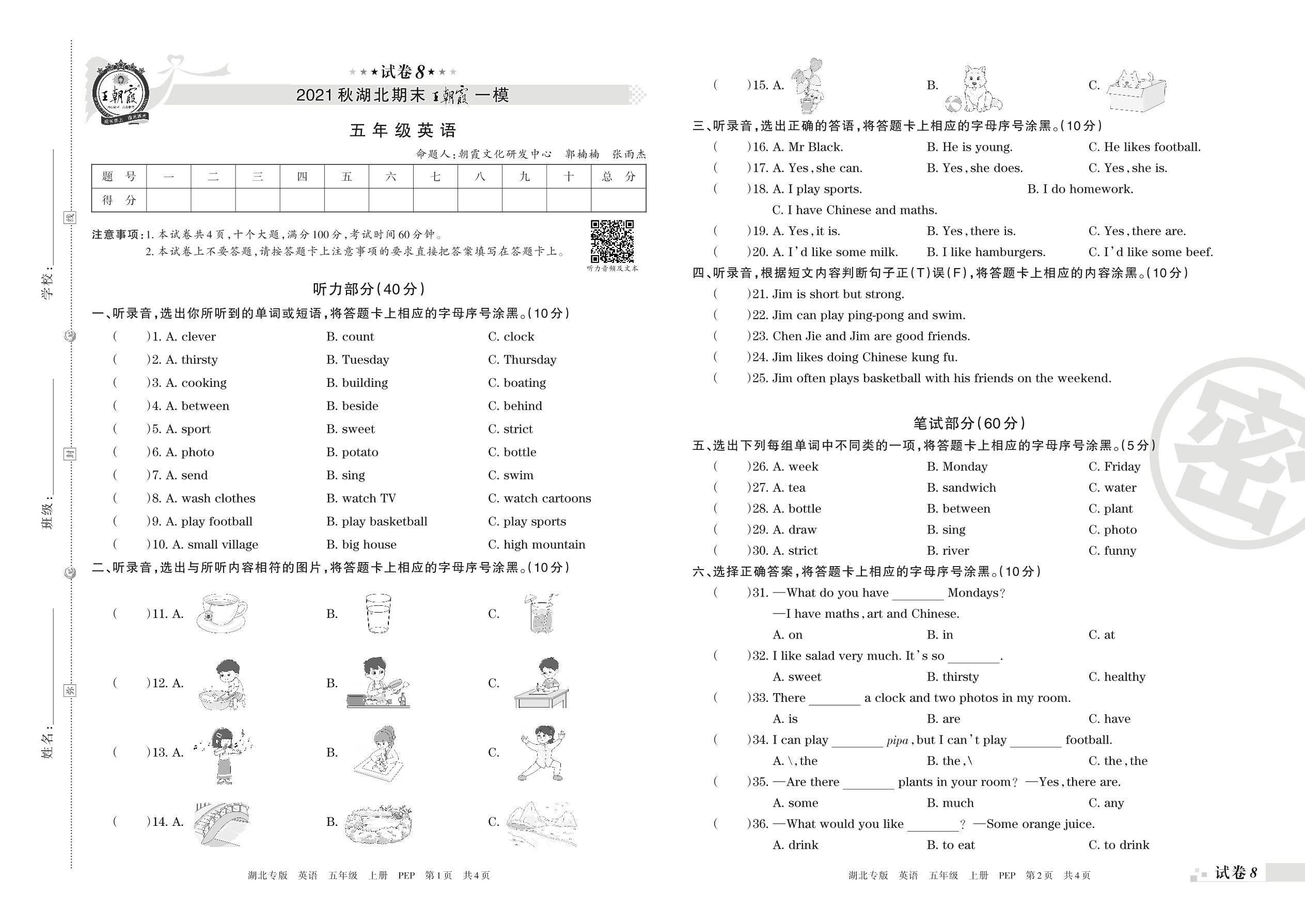 王朝霞期末模拟卷五年级上册英语(人教PEP版)_R211224143804557【8】