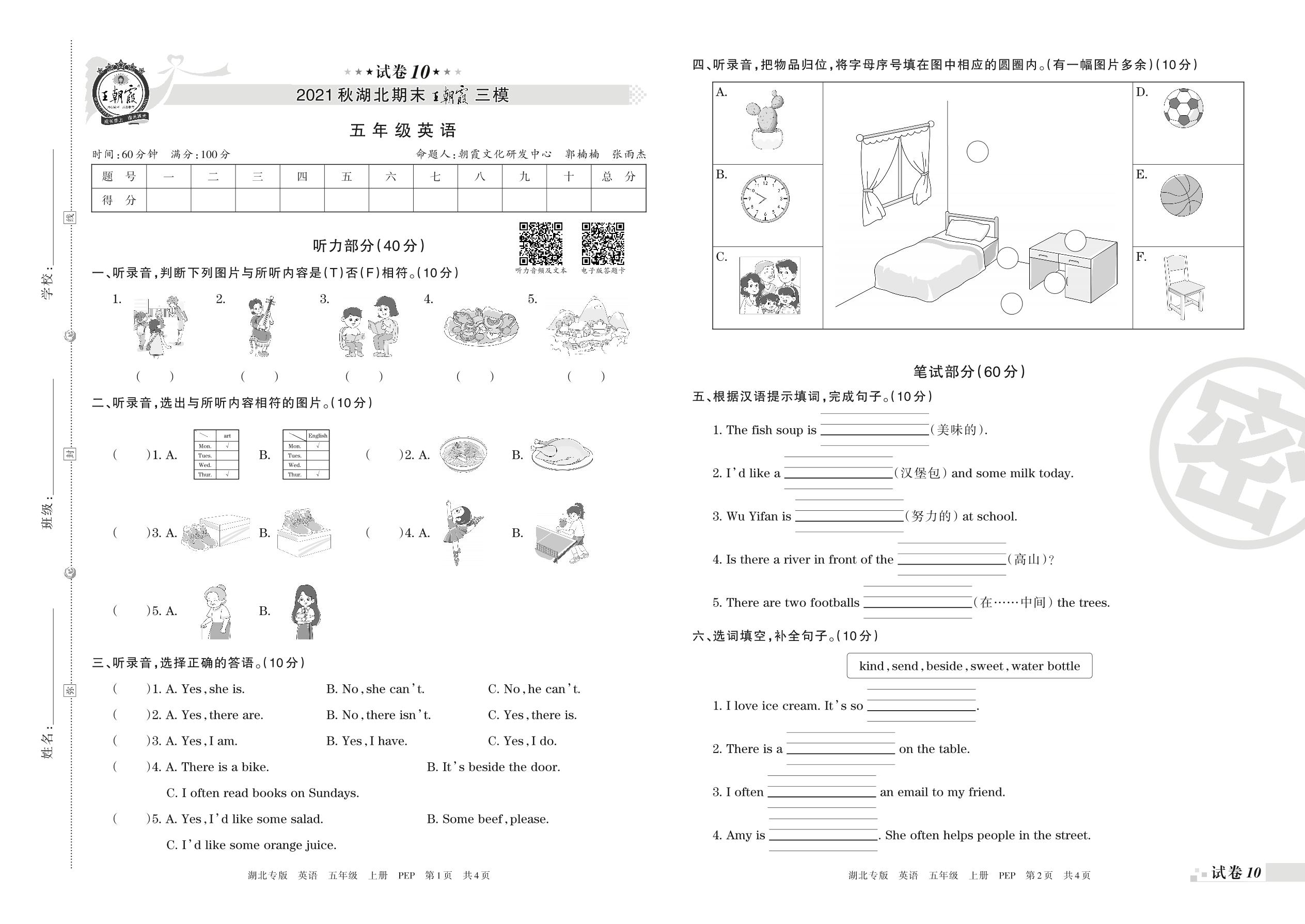 五年级英语人教PEP版(三起始)上册期末卷