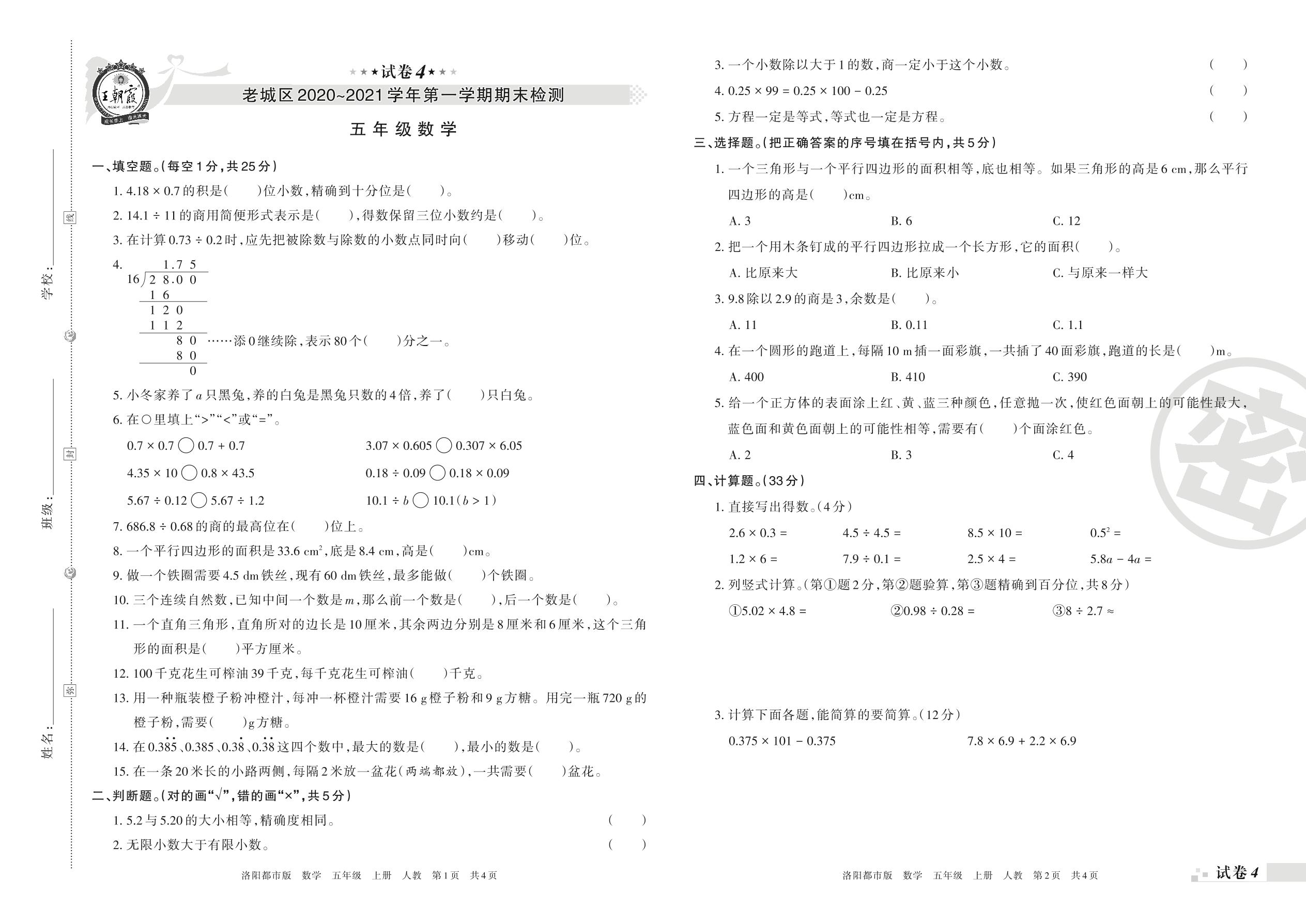老城区2020~2021学年第一学期期末检测五年级数学(人教版)【4】