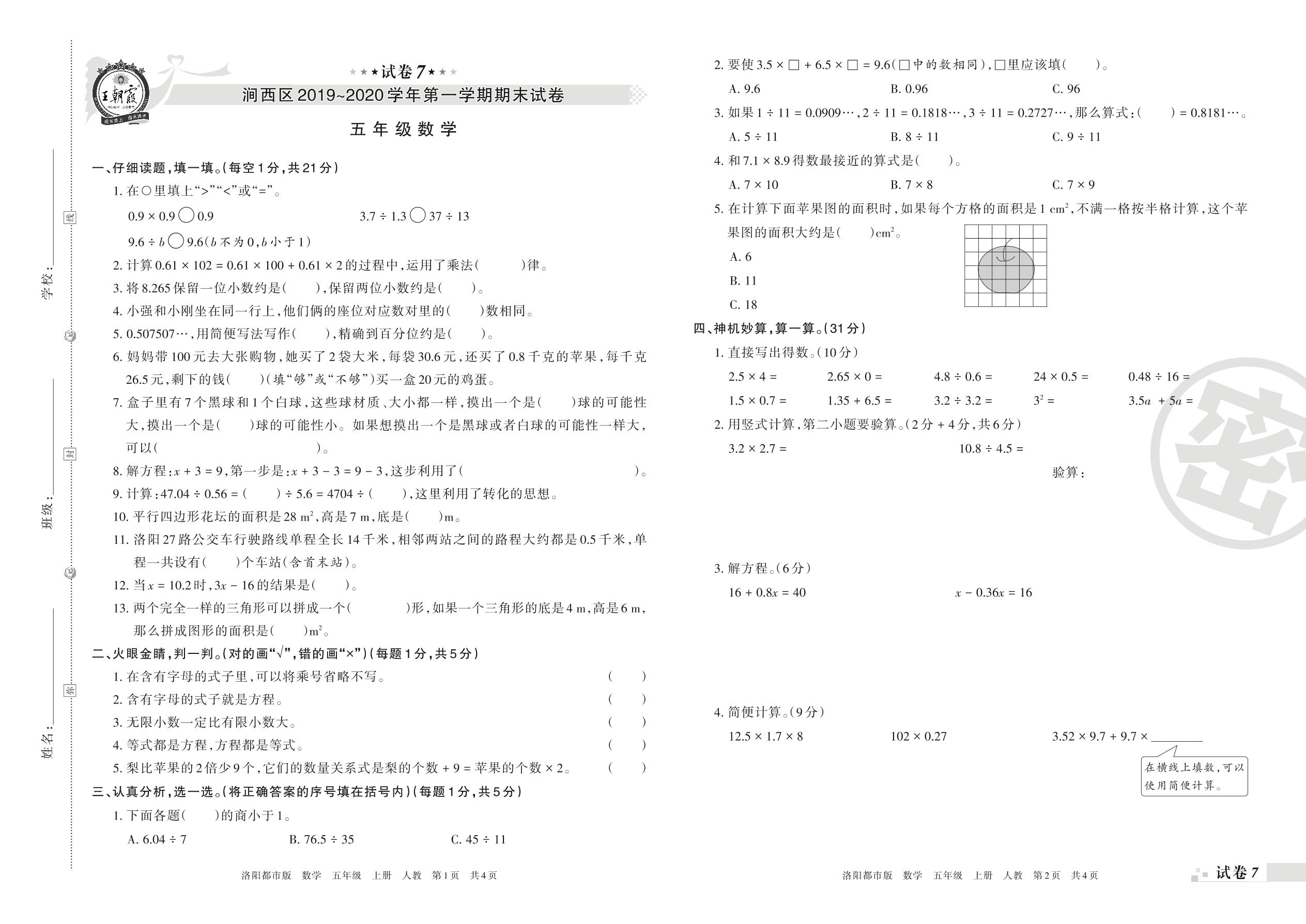 涧西区2019~2020学年第一学期期末试卷五年级数学(人教版)【7】