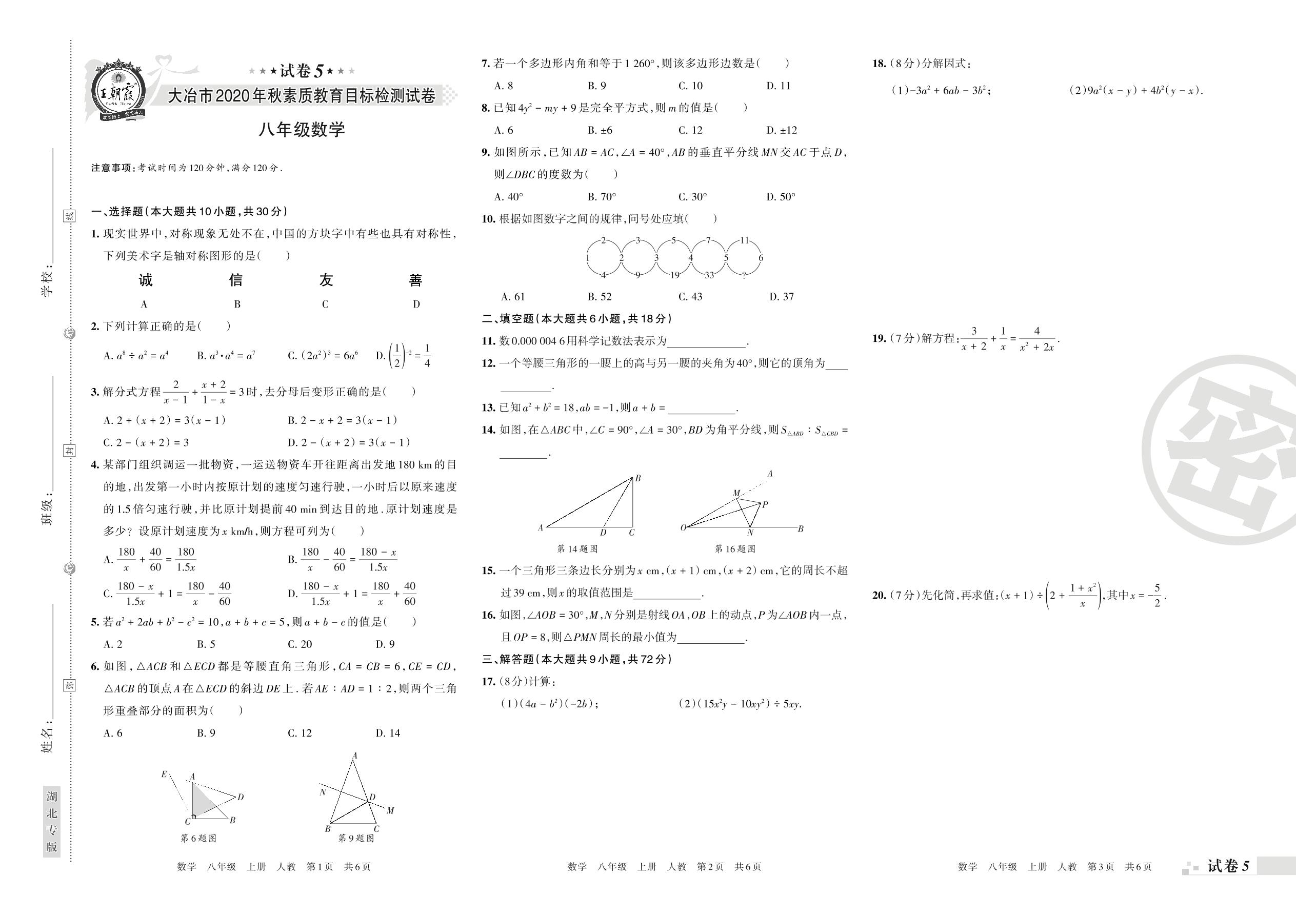 大冶市2020年秋素质教育目标检测试卷八年级数学(人教版)【5】