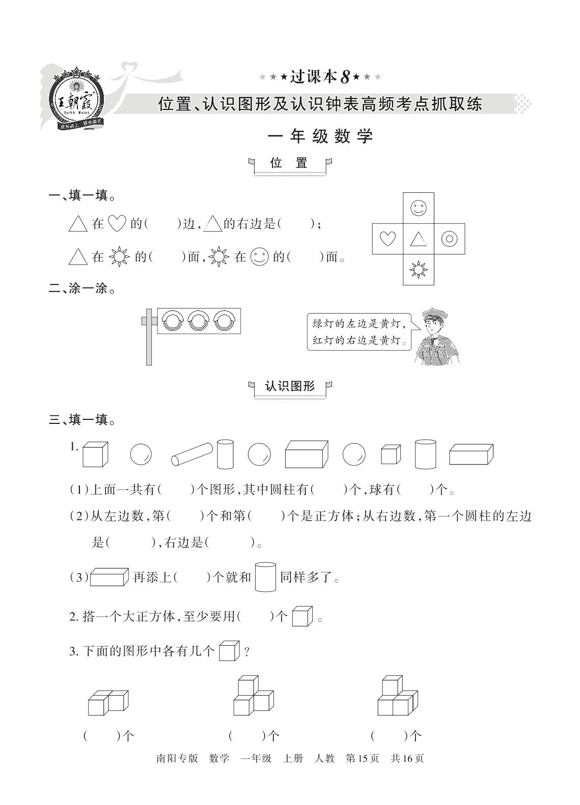 王朝霞期末过课本——位置、认识图形及认识钟表高频考点抓取练一年级上册数学(人教版)_R211224145003593【8】