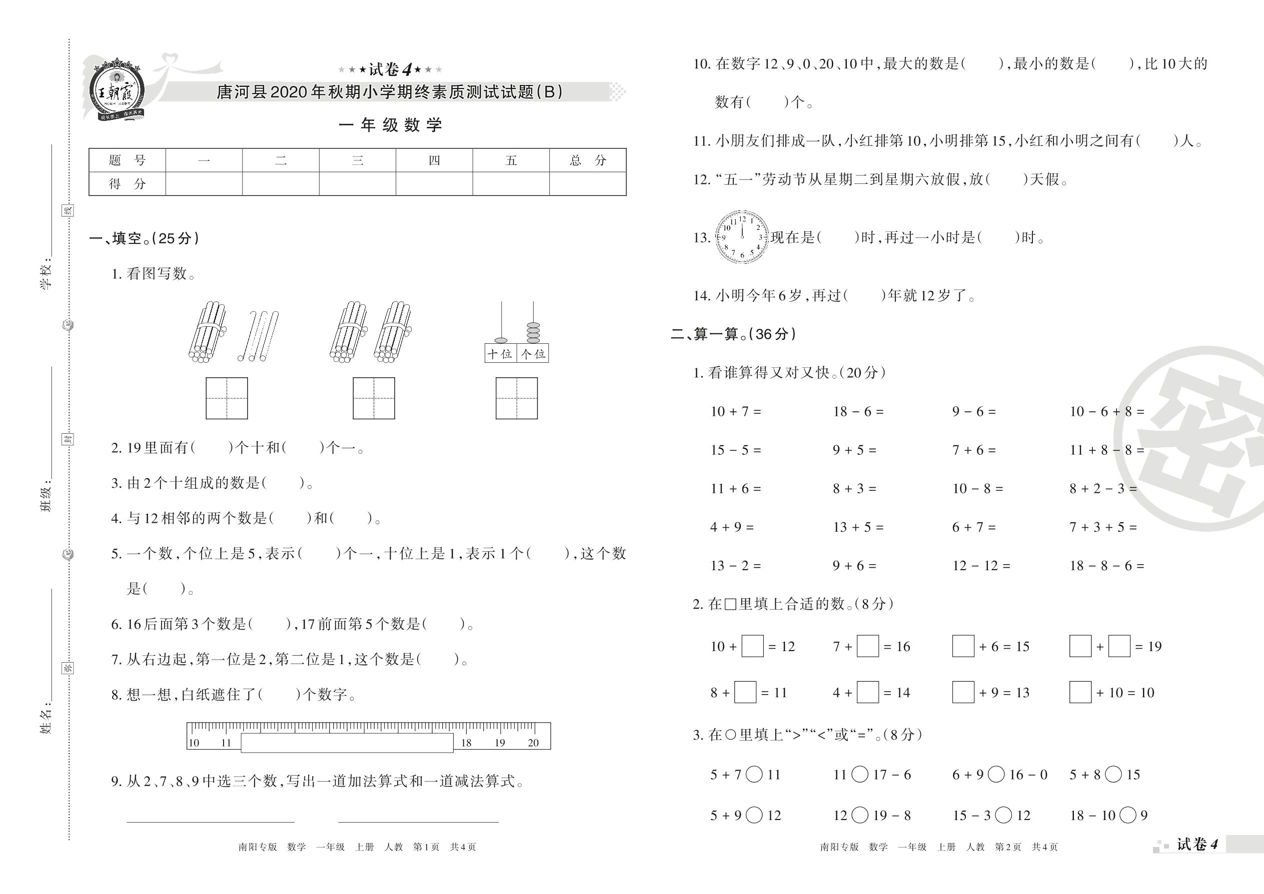 唐河县2020年秋期期终素质测试小学试题(B)一年级数学(人教版)【4】