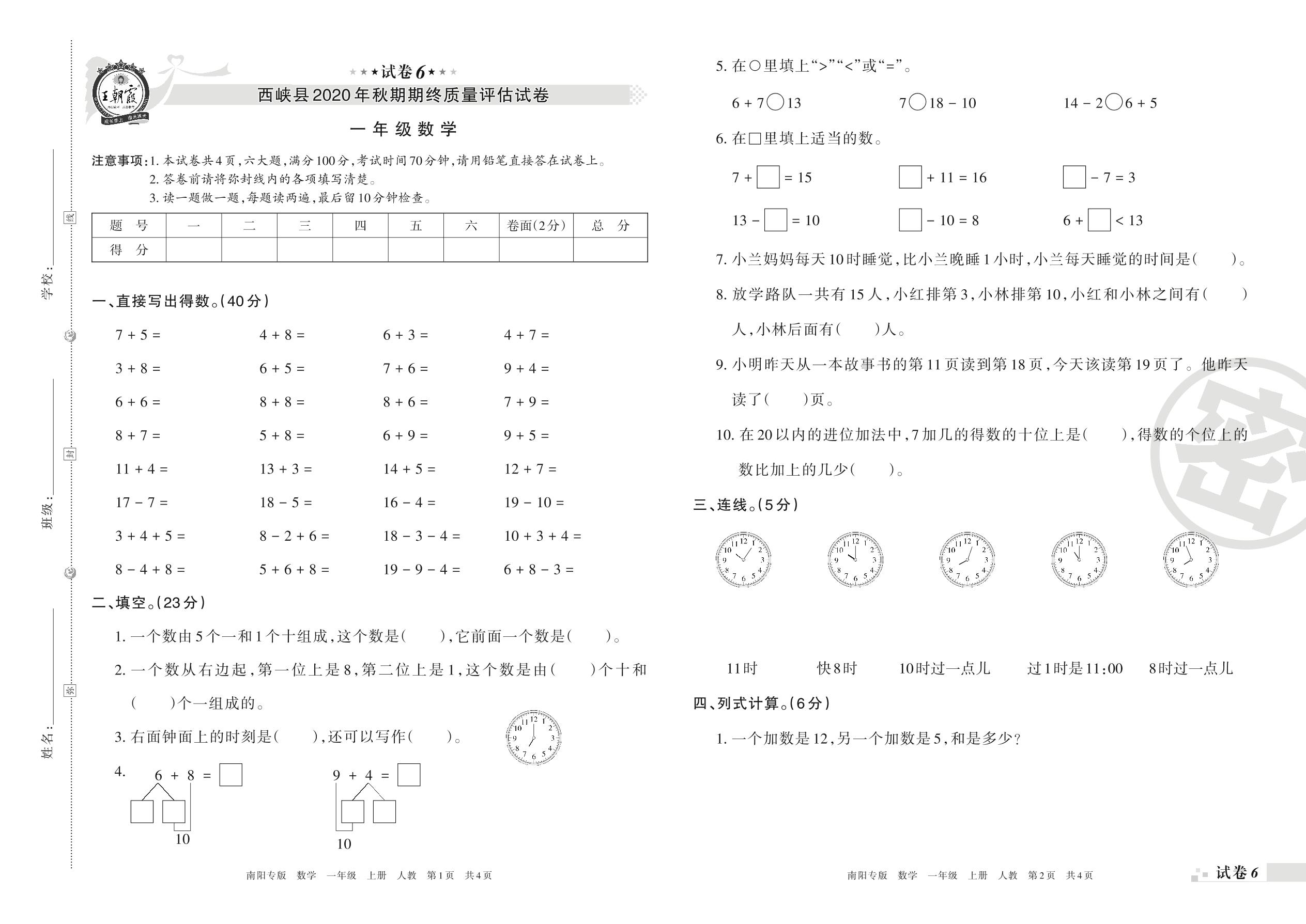 西峡县2020年秋期期终质量评估试卷一年级数学(人教版)【6】
