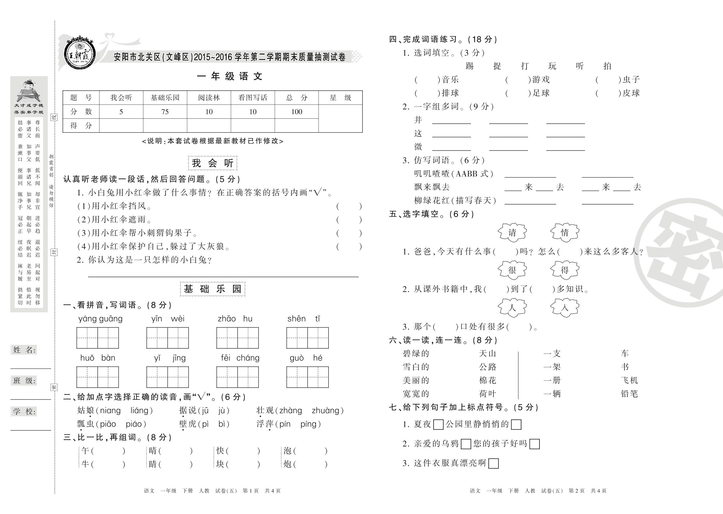 2015-2016学年第二学期安阳市北关区(文峰区)一年级语文试卷(人教版)【5】