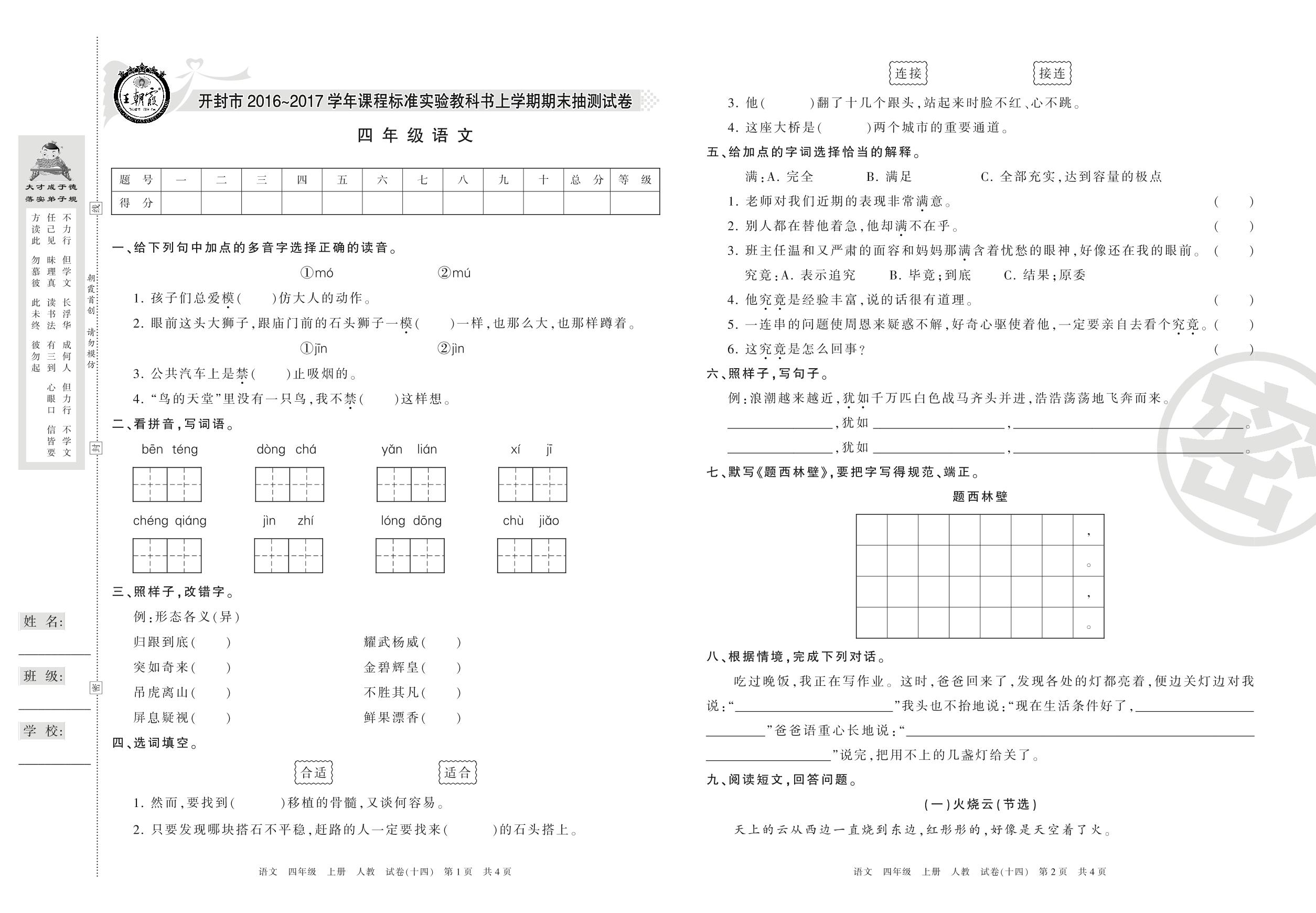 2016-2017学年第一学期开封市四年级语文试卷(人教版)【14】