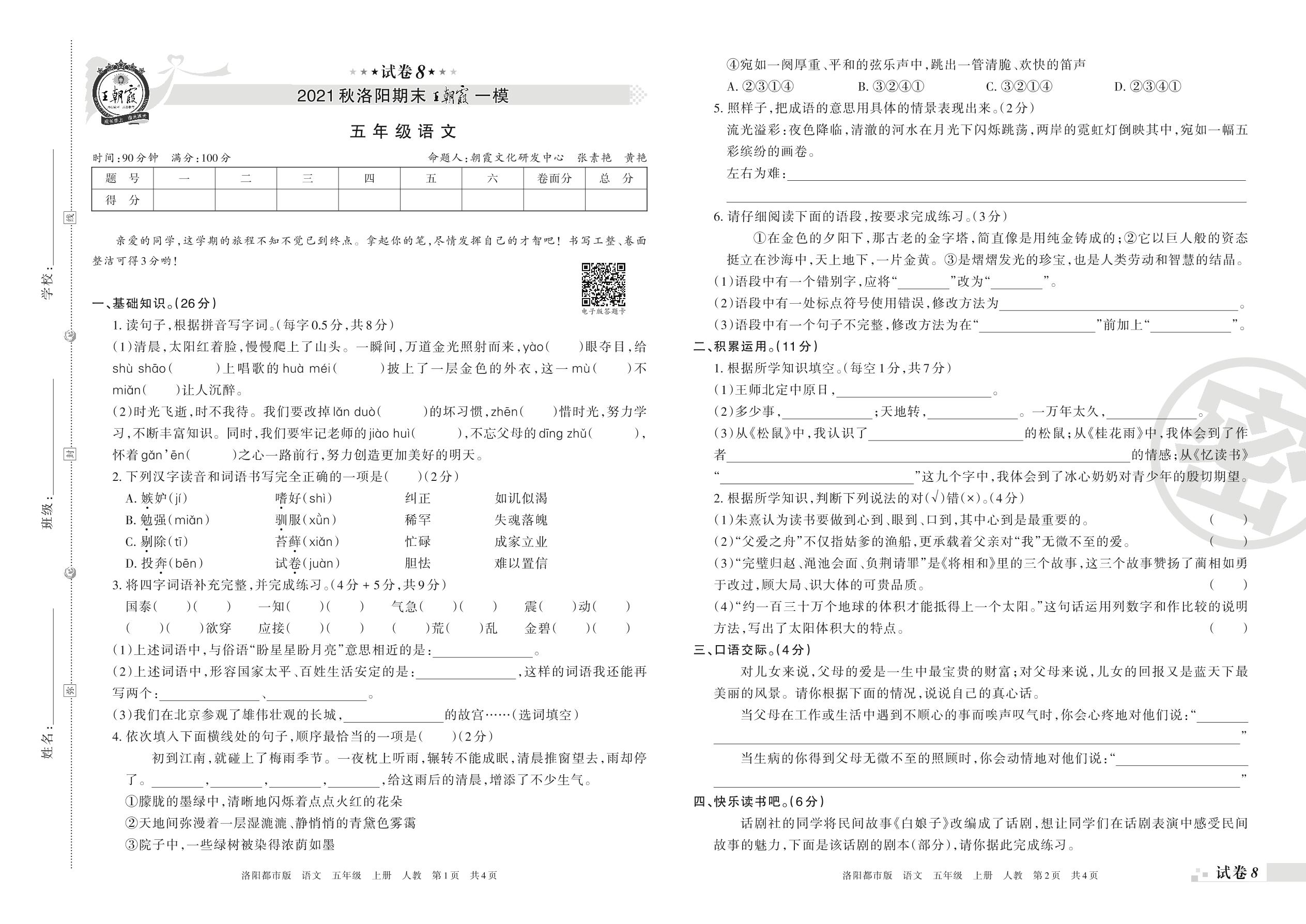 王朝霞期末模拟卷五年级上册语文(人教版)_R211224145614166【8】
