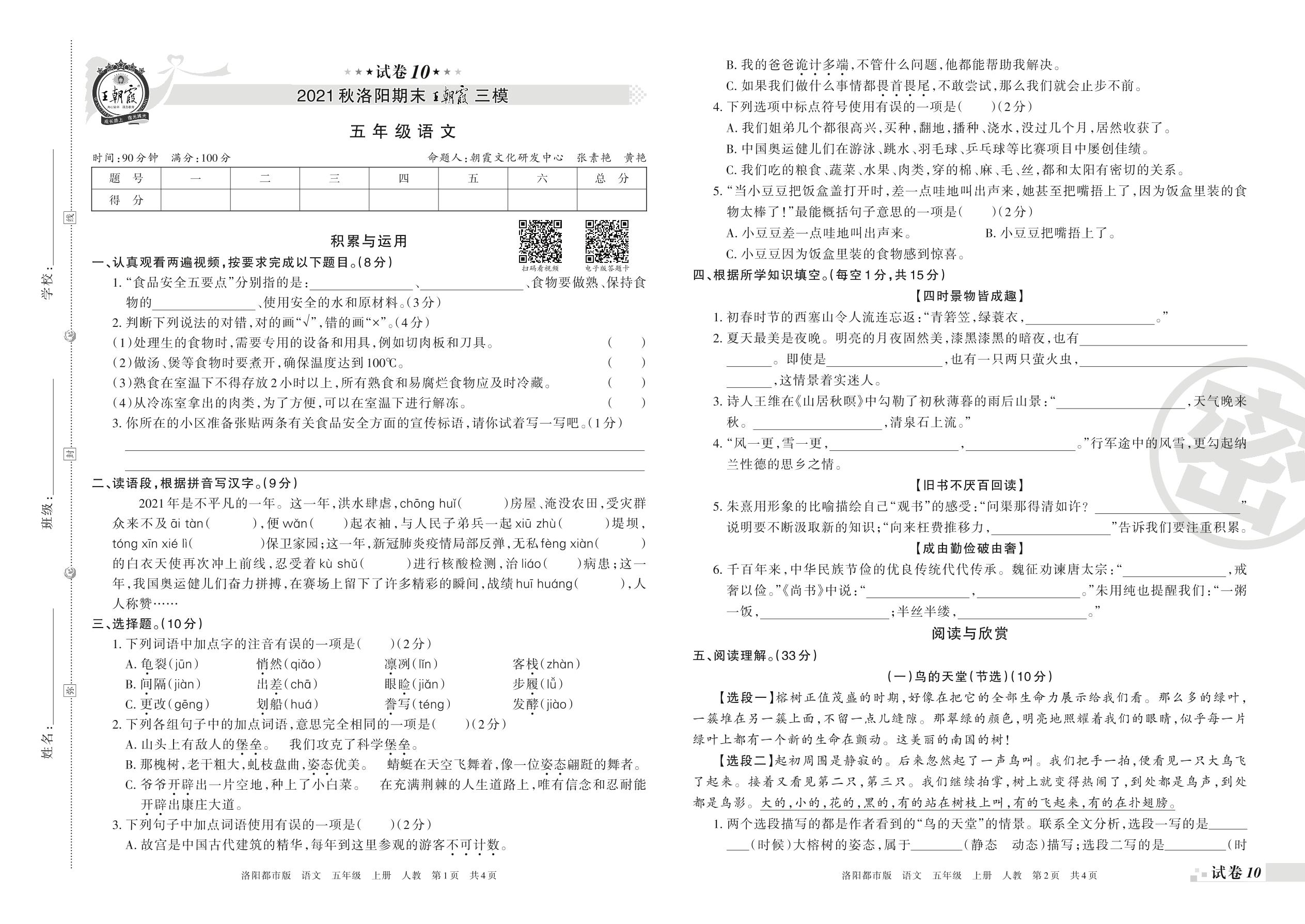 王朝霞期末模拟卷五年级上册语文(人教版)_R211224145614803【10】