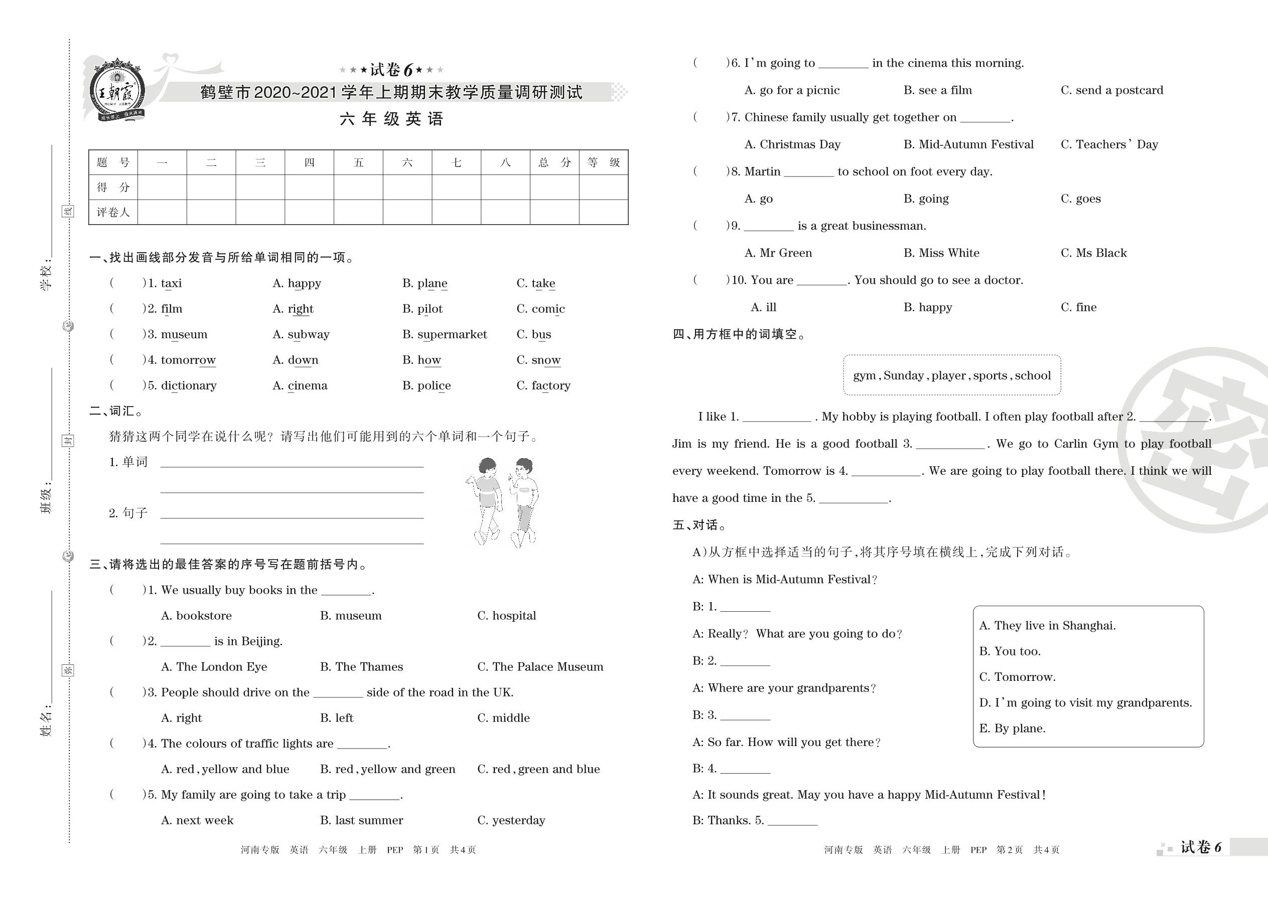 鹤壁市2020~2021学年上期期末教学质量调研测试六年级英语(人教PEP版)【6】