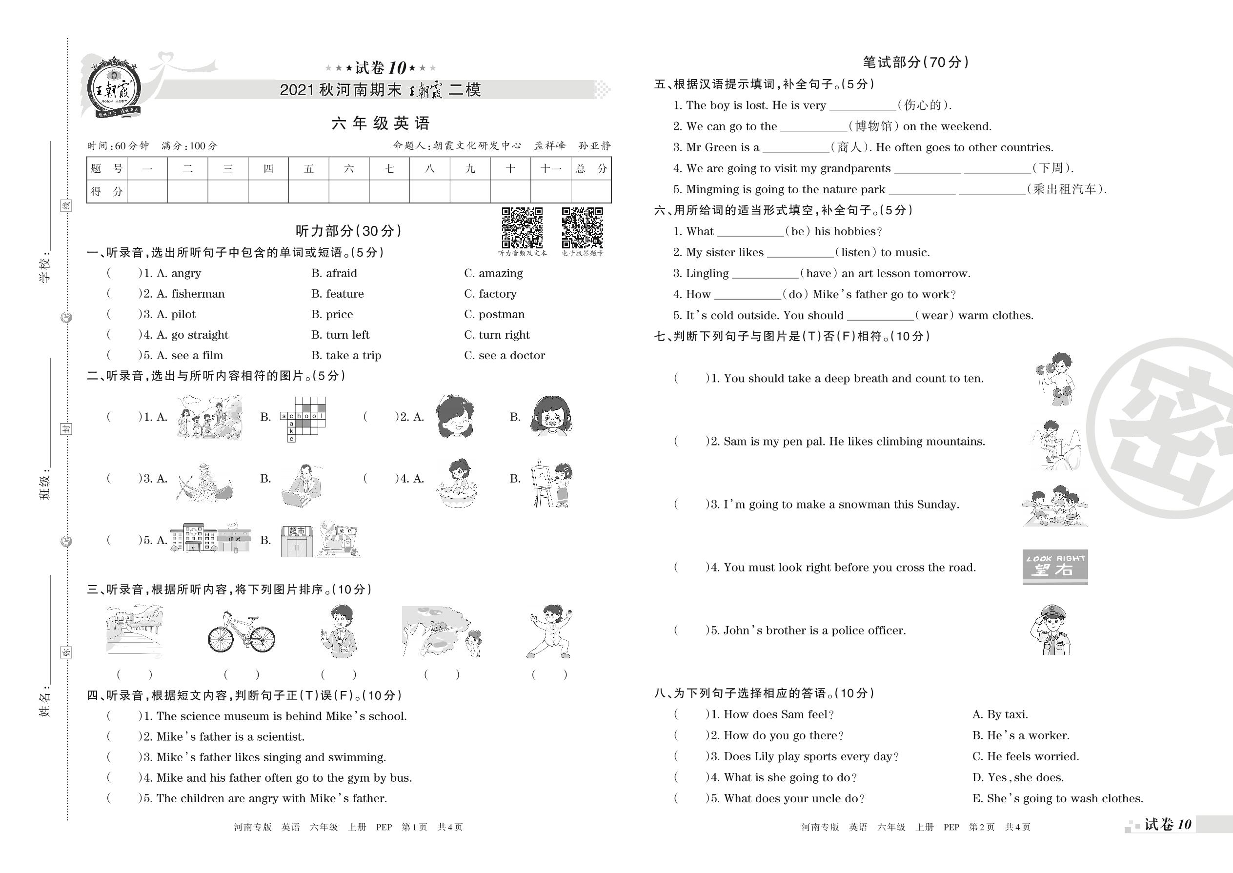 王朝霞期末模拟卷六年级上册英语(人教PEP版)_R211224145625781【10】