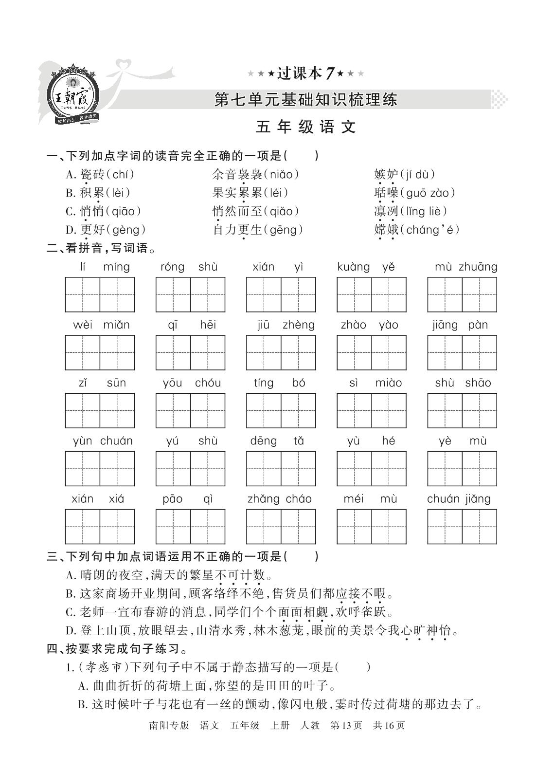 王朝霞期末过课本——第七单元基础知识梳理练五年级上册语文(人教版)_R211224150727919【7】