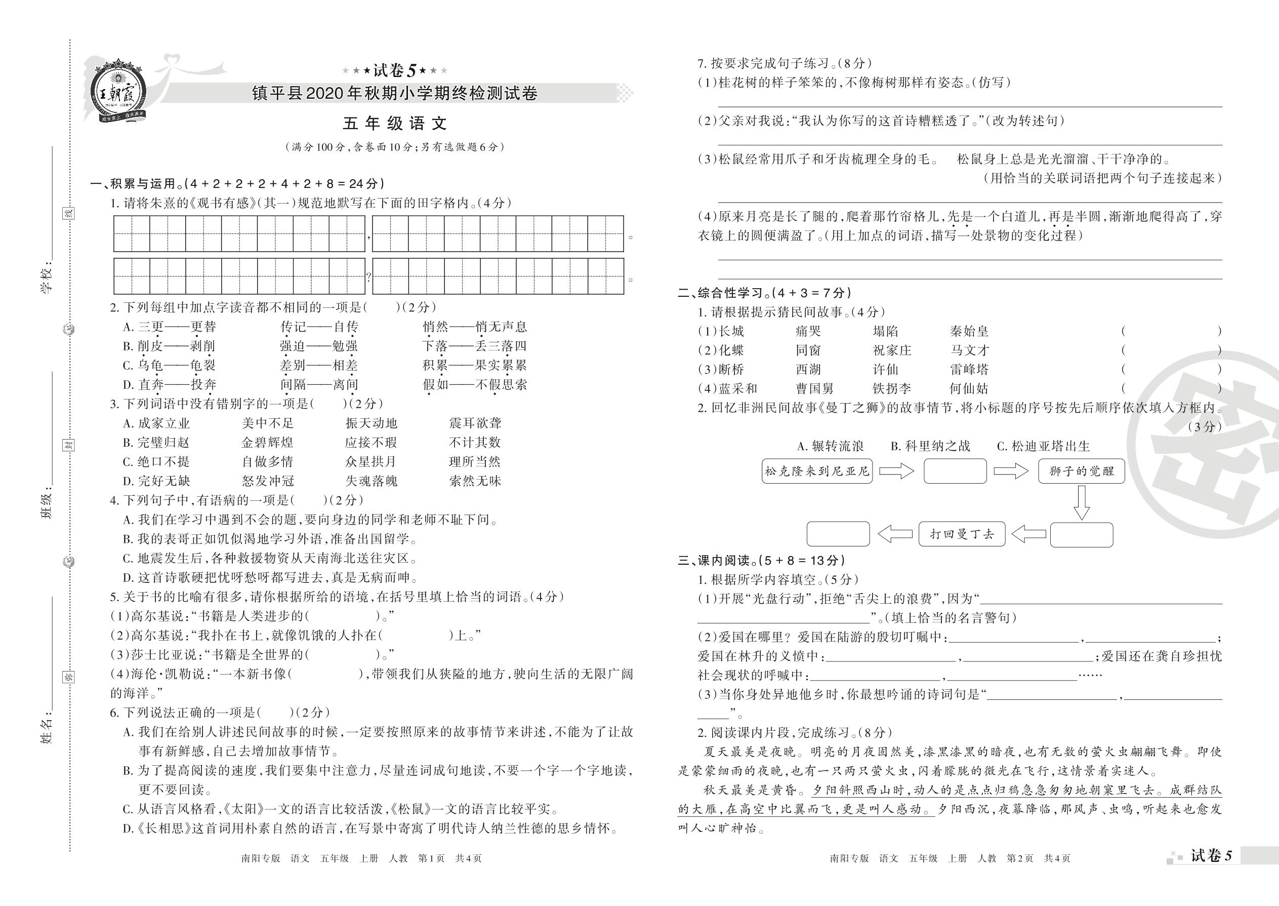 镇平县2020年秋期小学期终检测试卷五年级语文(人教版)【5】