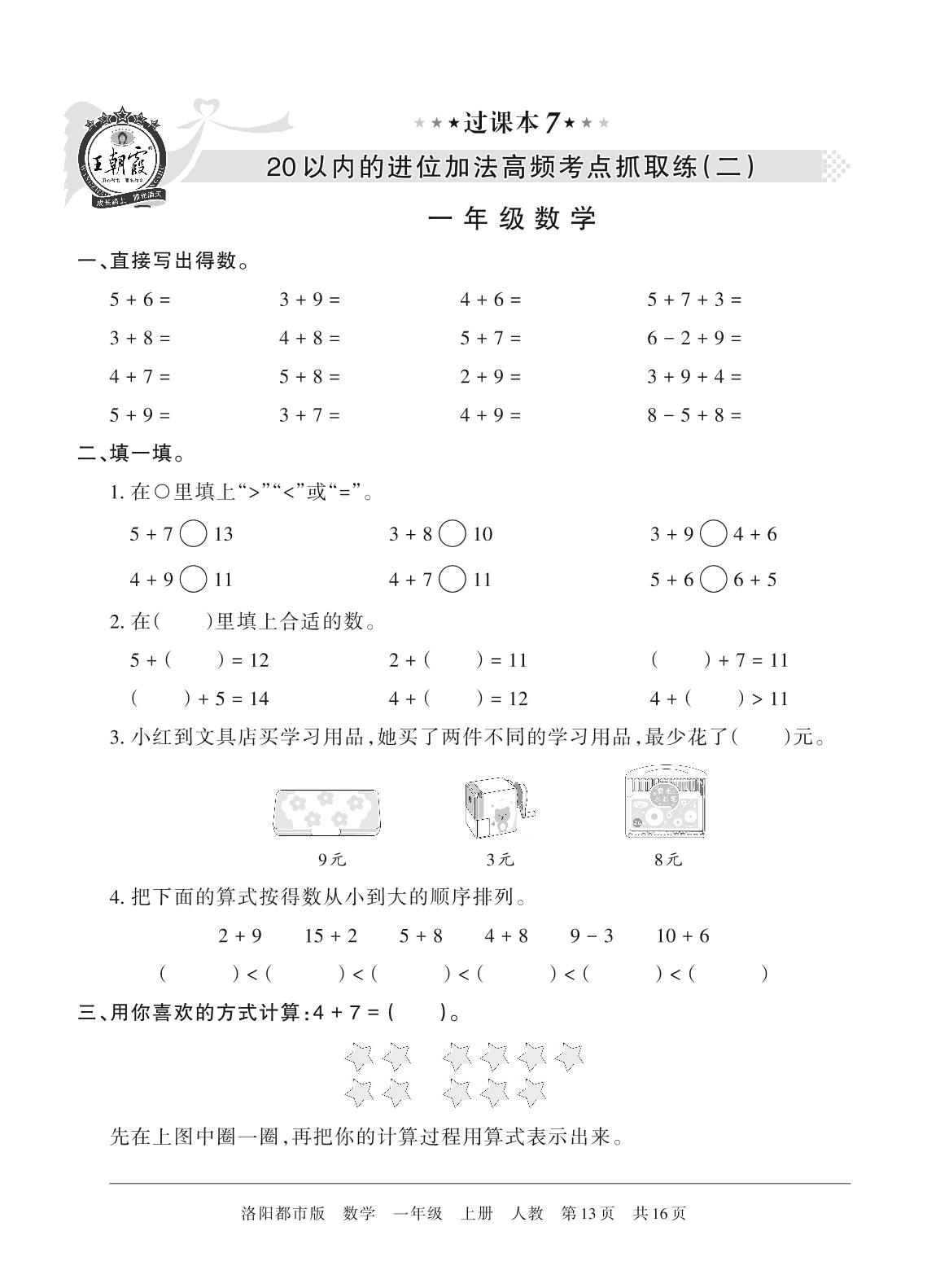 王朝霞期末过课本——20以内的进位加法高频考点抓取练(二)一年级上册数学(人教版)_R211224150827119【7】