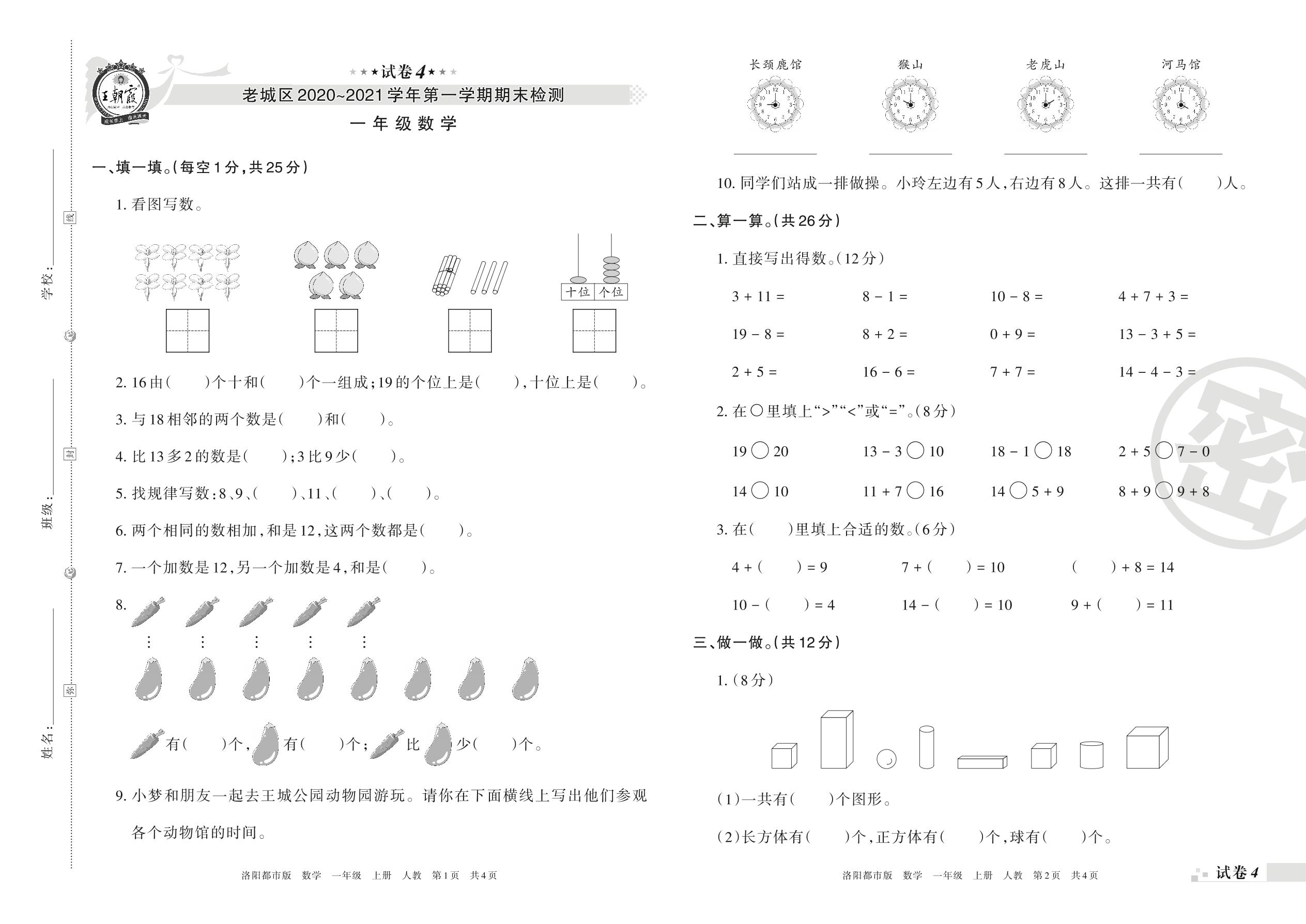 老城区2020~2021学年第一学期期末检测一年级数学(人教版)【4】