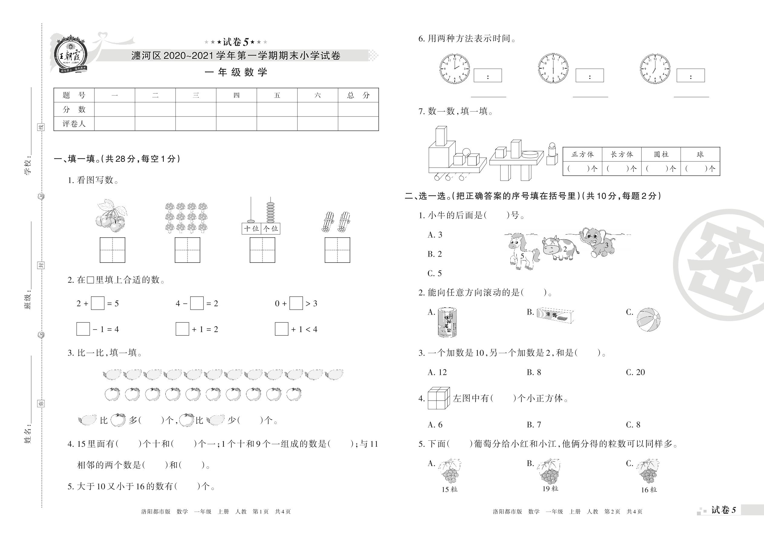 瀍河区2020~2021学年第一学期期末小学试卷一年级数学(人教版)【5】