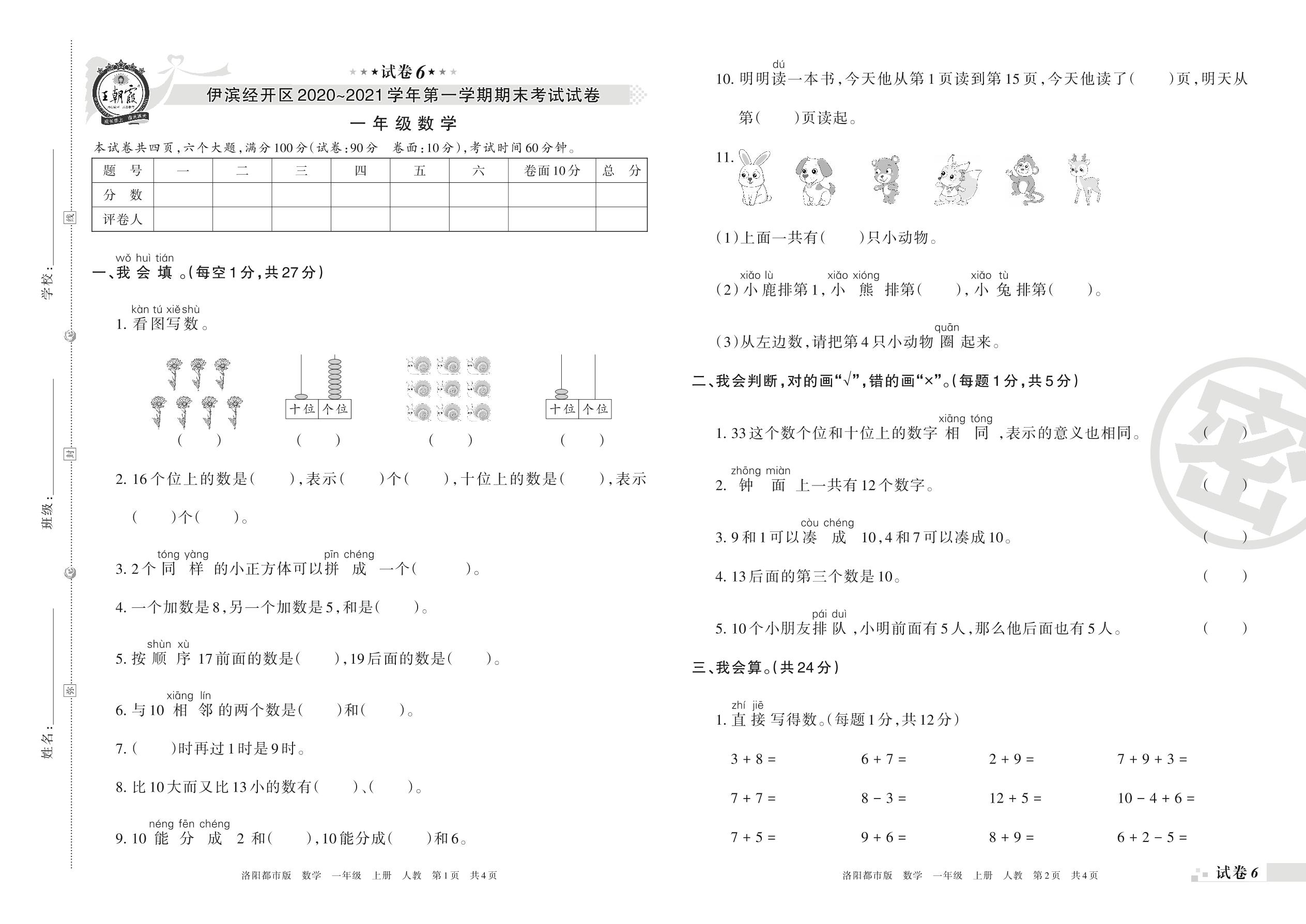 伊滨经开区2020~2021学年第一学期期末考试试卷一年级数学(人教版)【6】