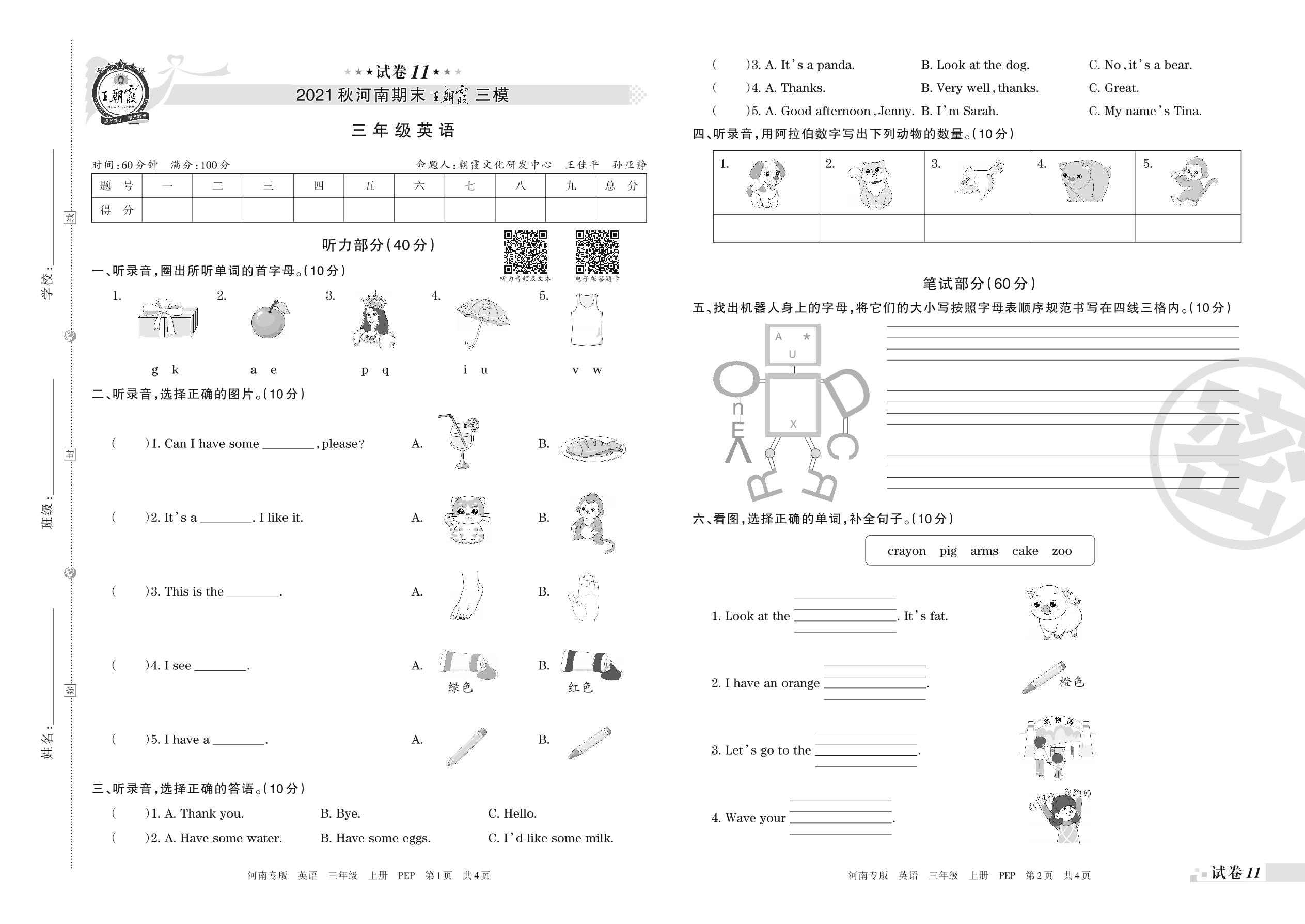王朝霞期末模拟卷三年级上册英语(人教PEP版)【11】
