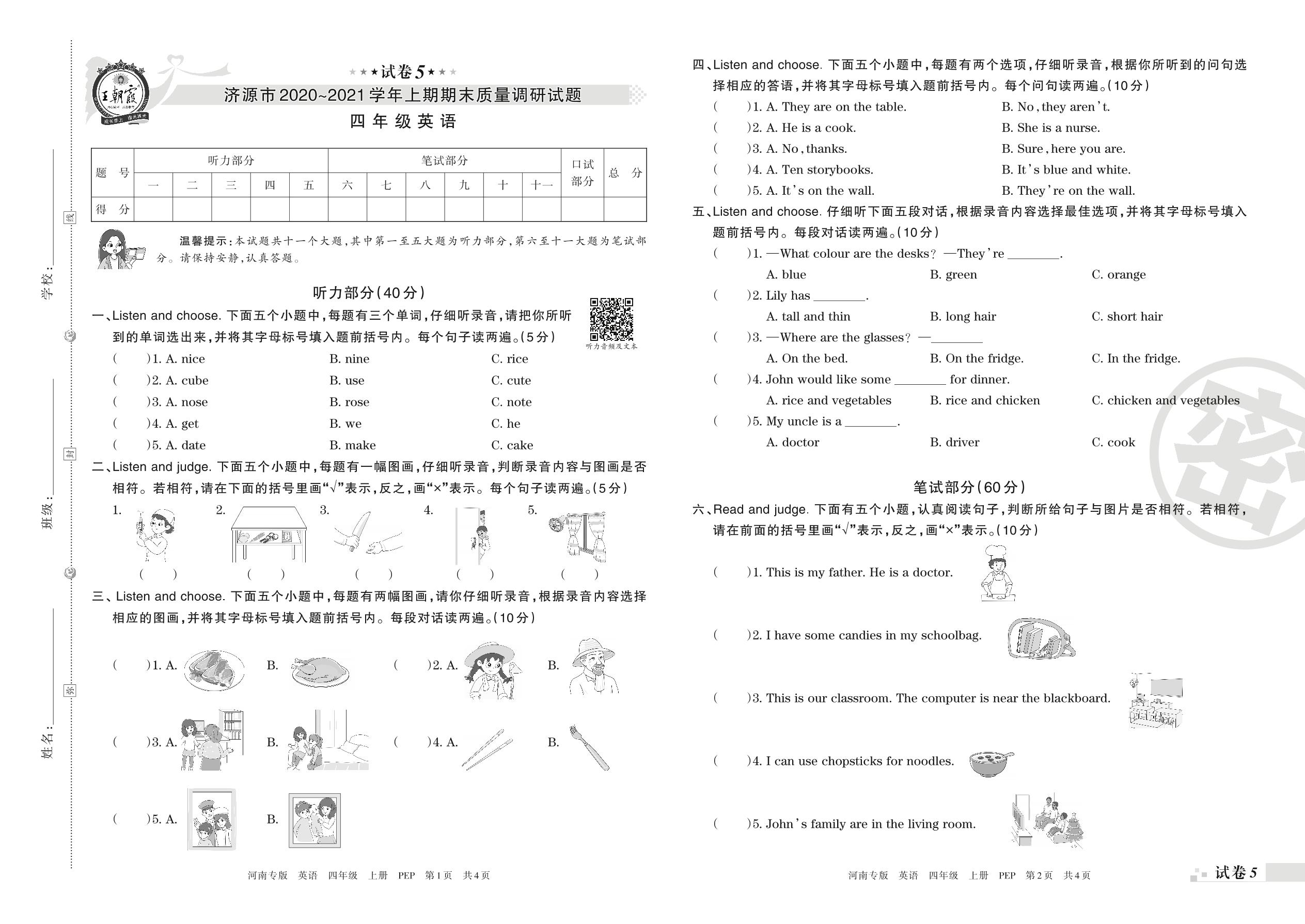 济源市2020~2021学年上期期末质量调研试题四年级英语(人教PEP版)【5】