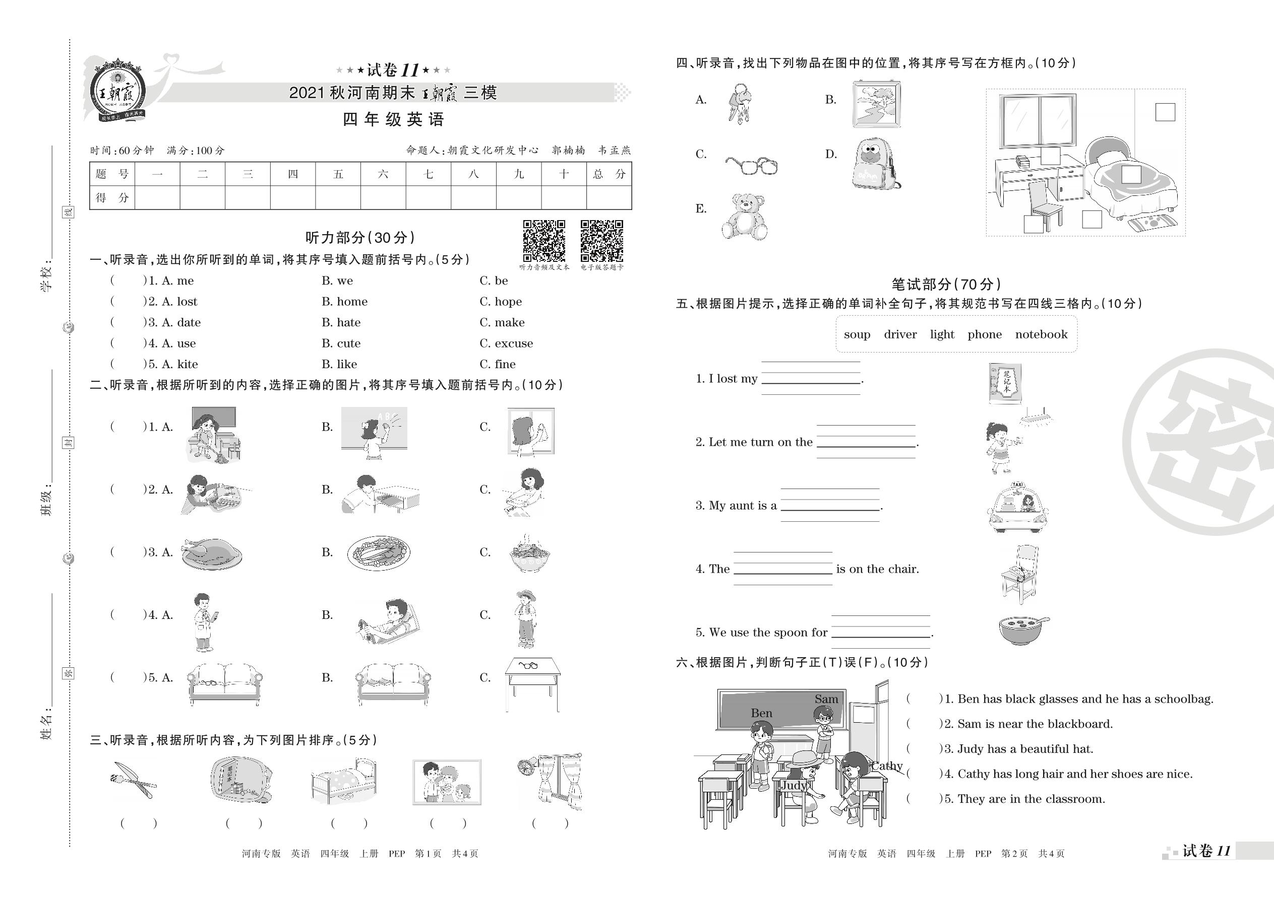 王朝霞期末模拟卷四年级上册英语(人教PEP版)【11】