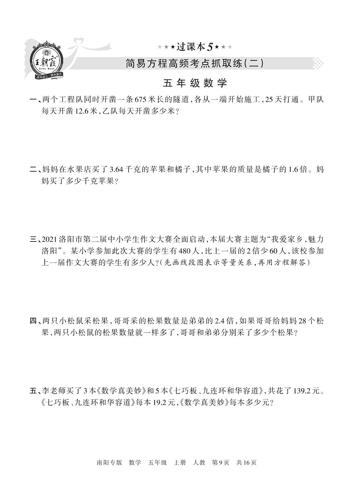 王朝霞期末过课本——简易方程高频考点抓取练(二)五年级上册数学(人教版)_R211224151434232【5】