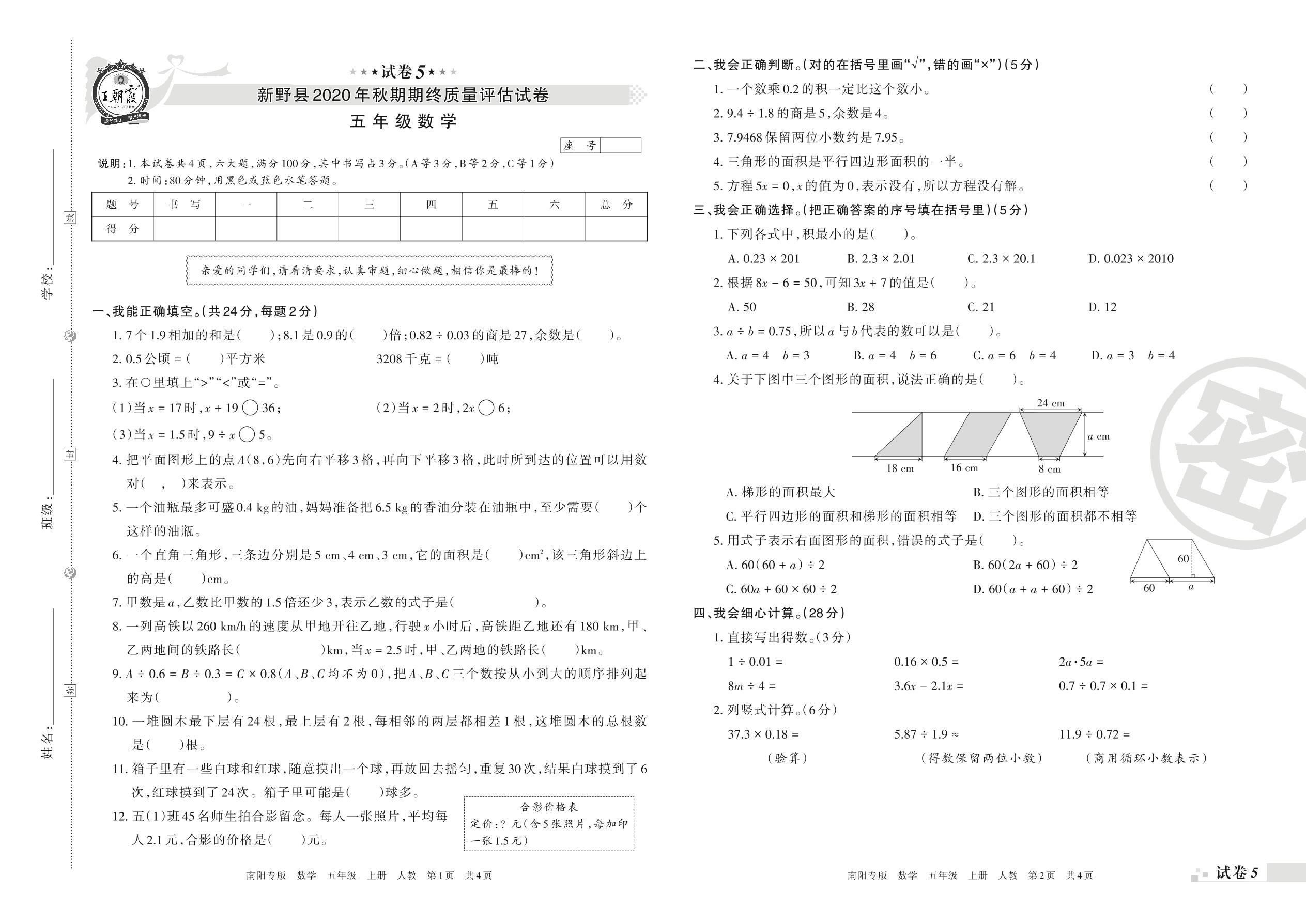 新野县2020年秋期期终质量评估试卷五年级数学(人教版)【5】