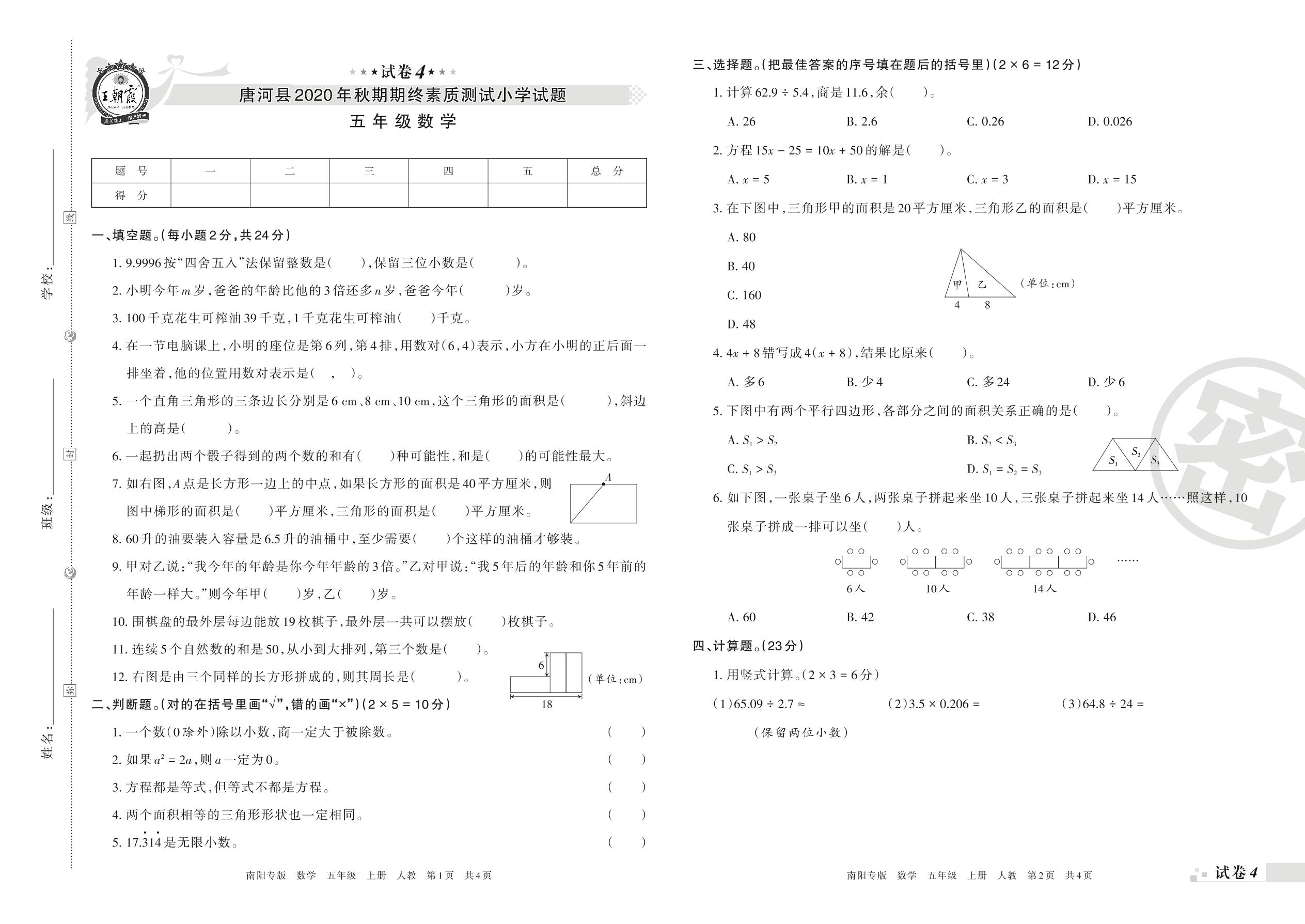 唐河县2020年秋期期终素质测试小学试题五年级数学(人教版)【4】