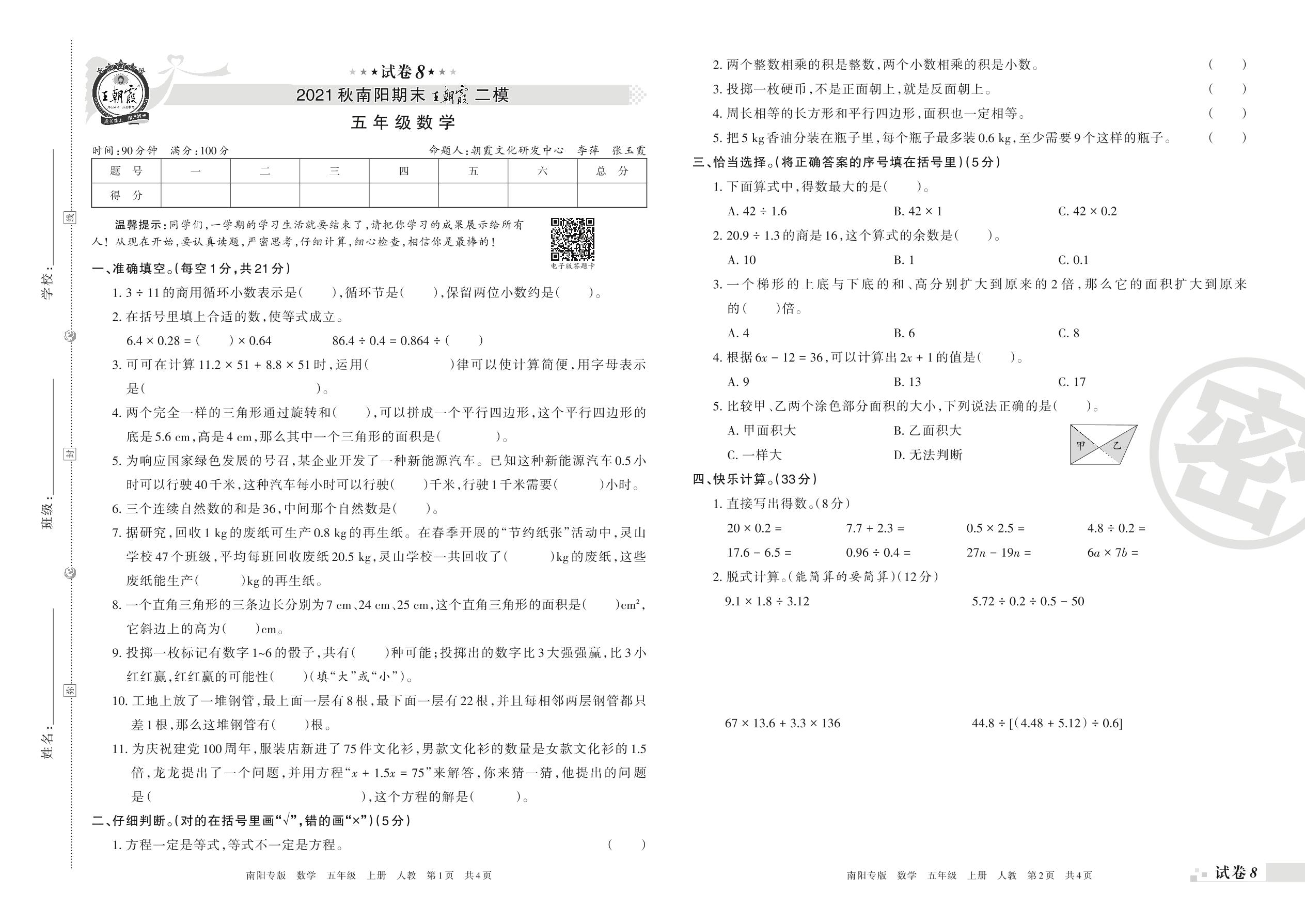 王朝霞期末模拟卷五年级上册数学(人教版)_R211224151435864【8】