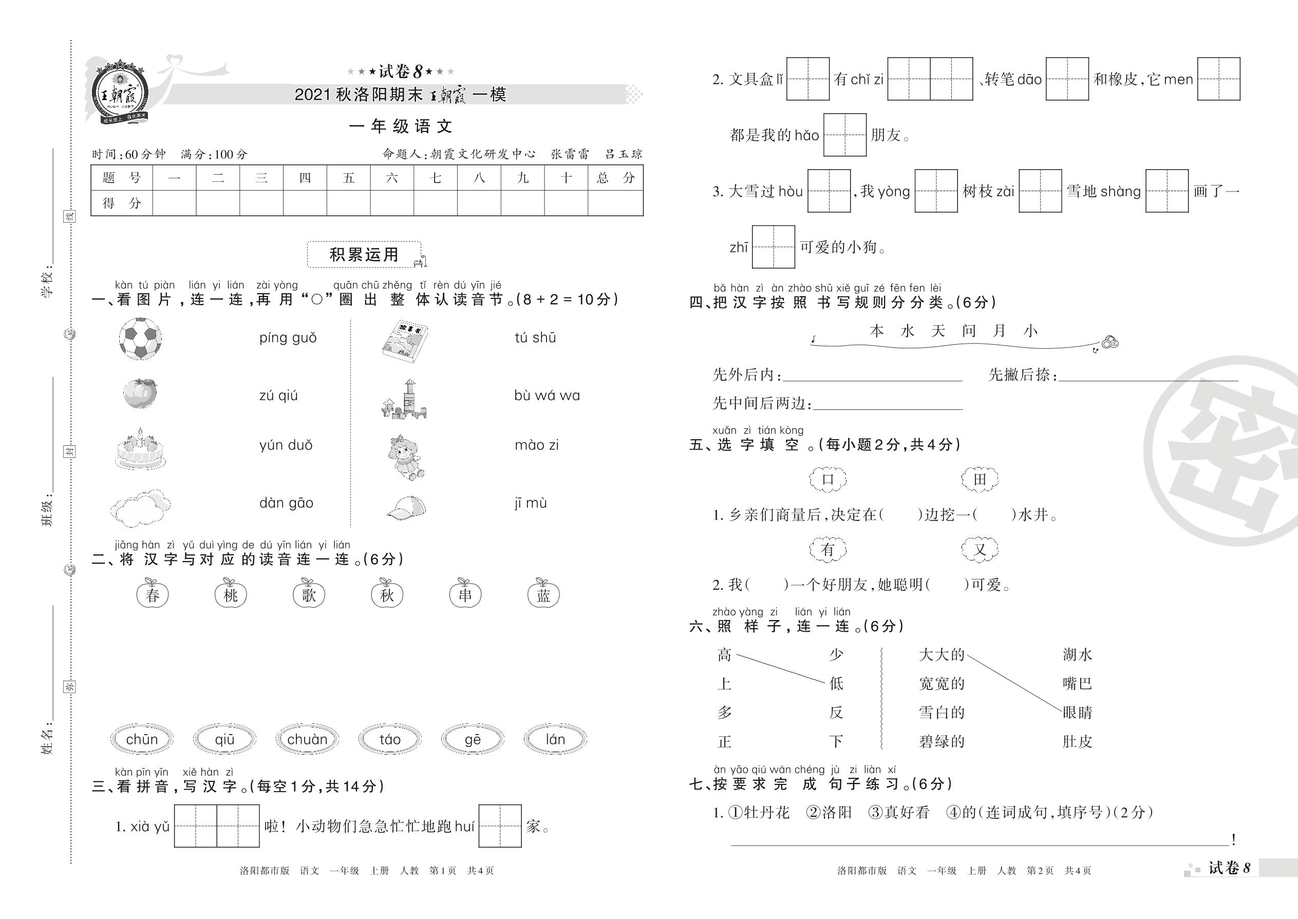 王朝霞期末模拟卷一年级上册语文(人教版)_R211224151532627【8】