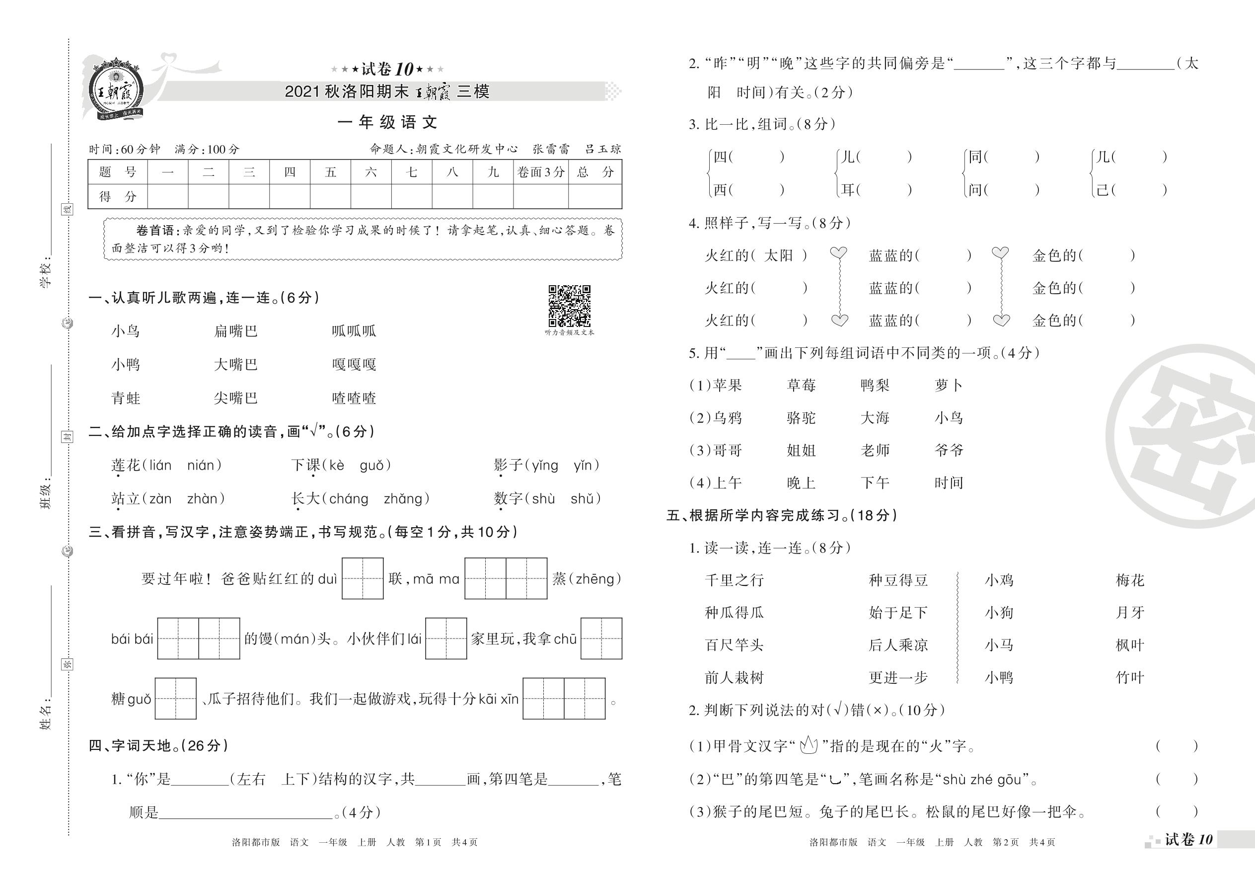 王朝霞期末模拟卷一年级上册语文(人教版)_R211224151532052【10】