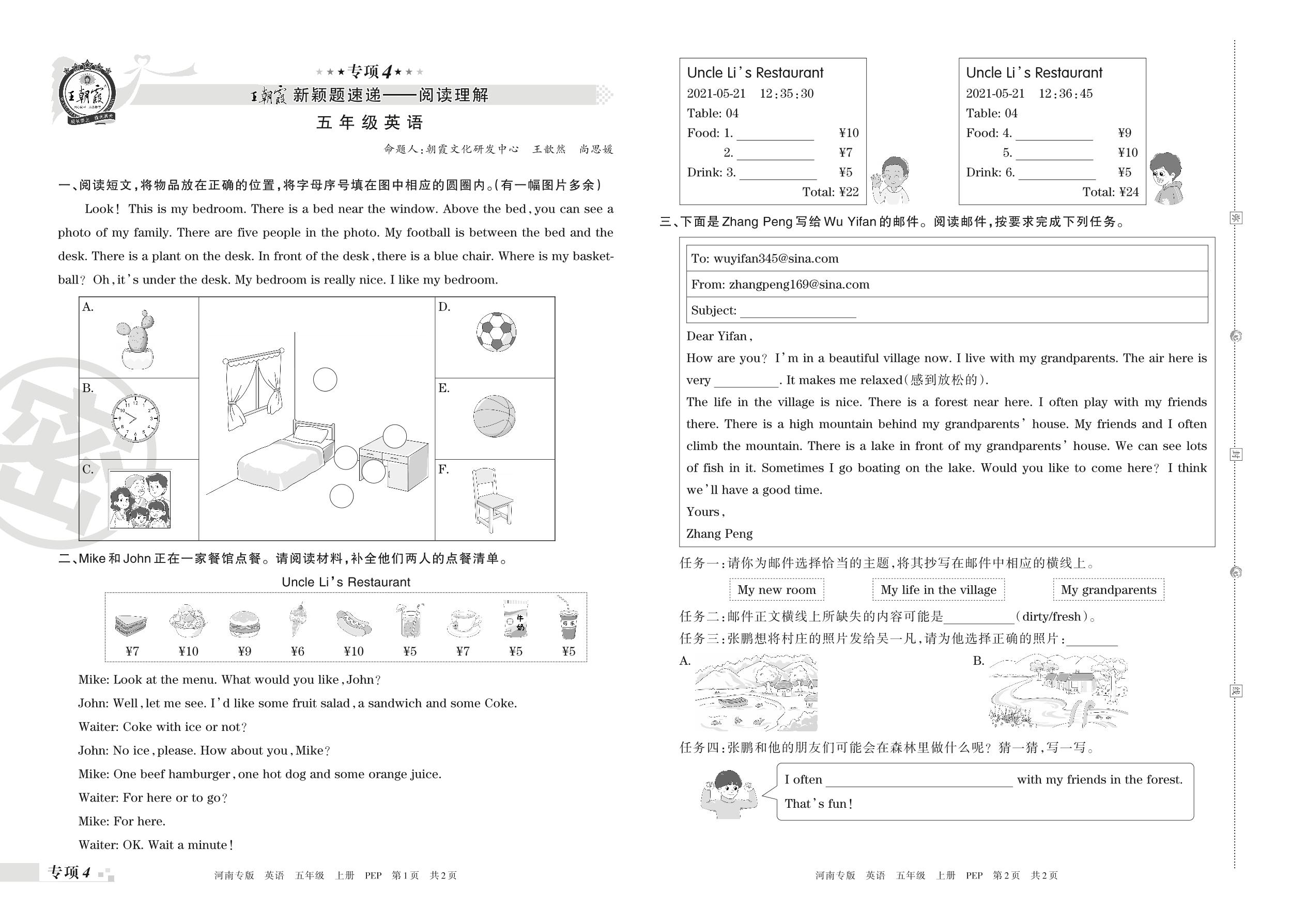 王朝霞期末专项卷——新颖题速递:阅读理解五年级上册英语(人教PEP版)_R211224151734452【4】