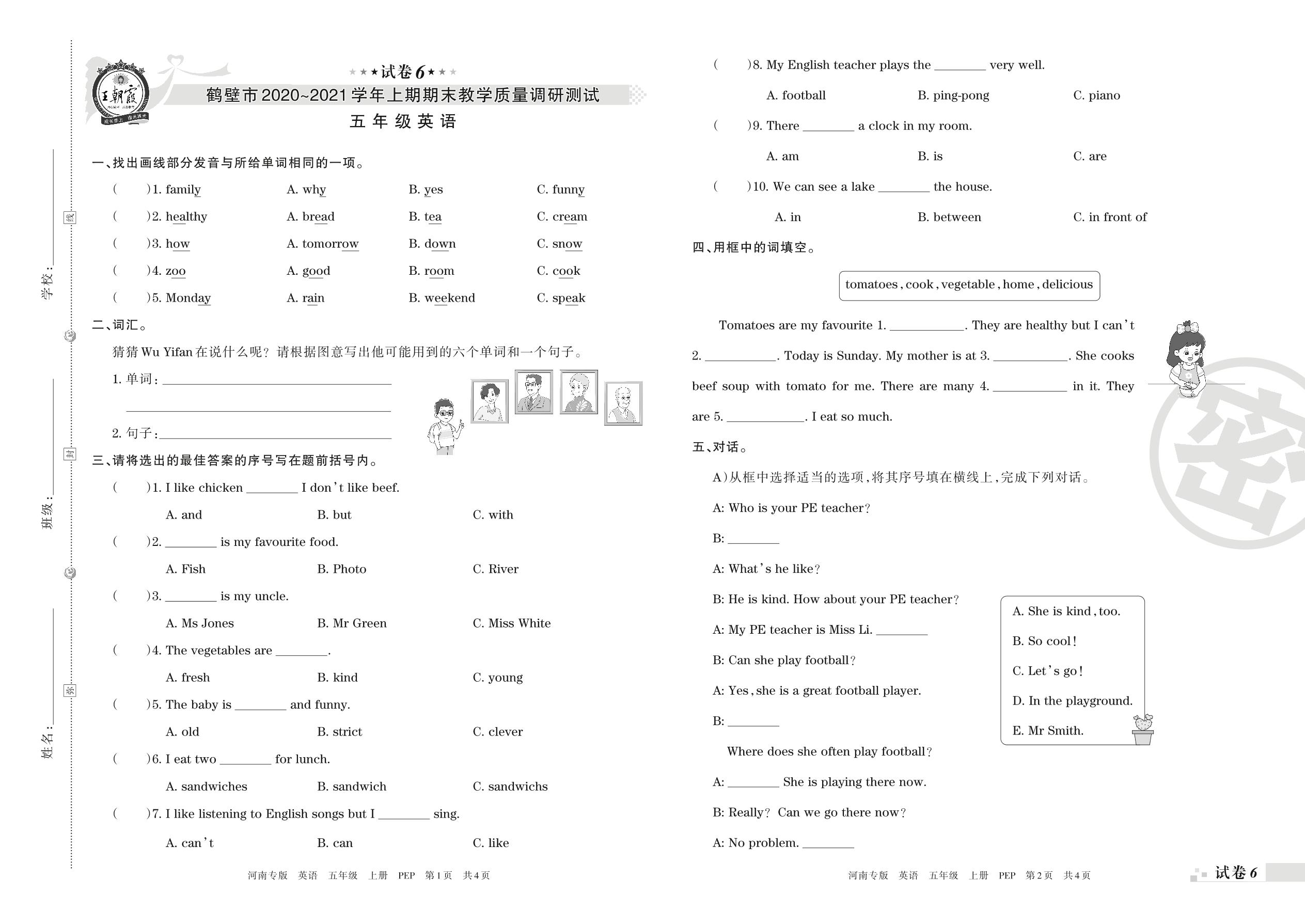 鹤壁市2020~2021学年上期期末教学质量调研测试五年级英语(人教PEP版)【6】