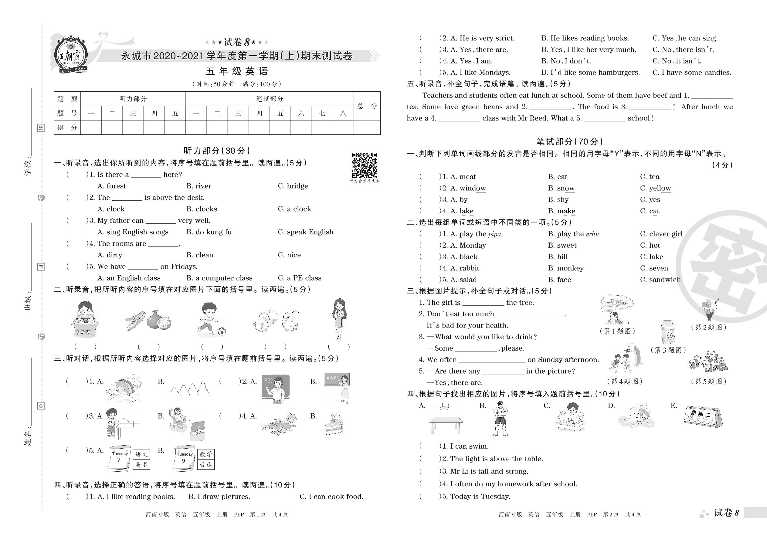 永城市2020~2021学年度第一学期(上)期末测试卷五年级英语(人教PEP版)【8】