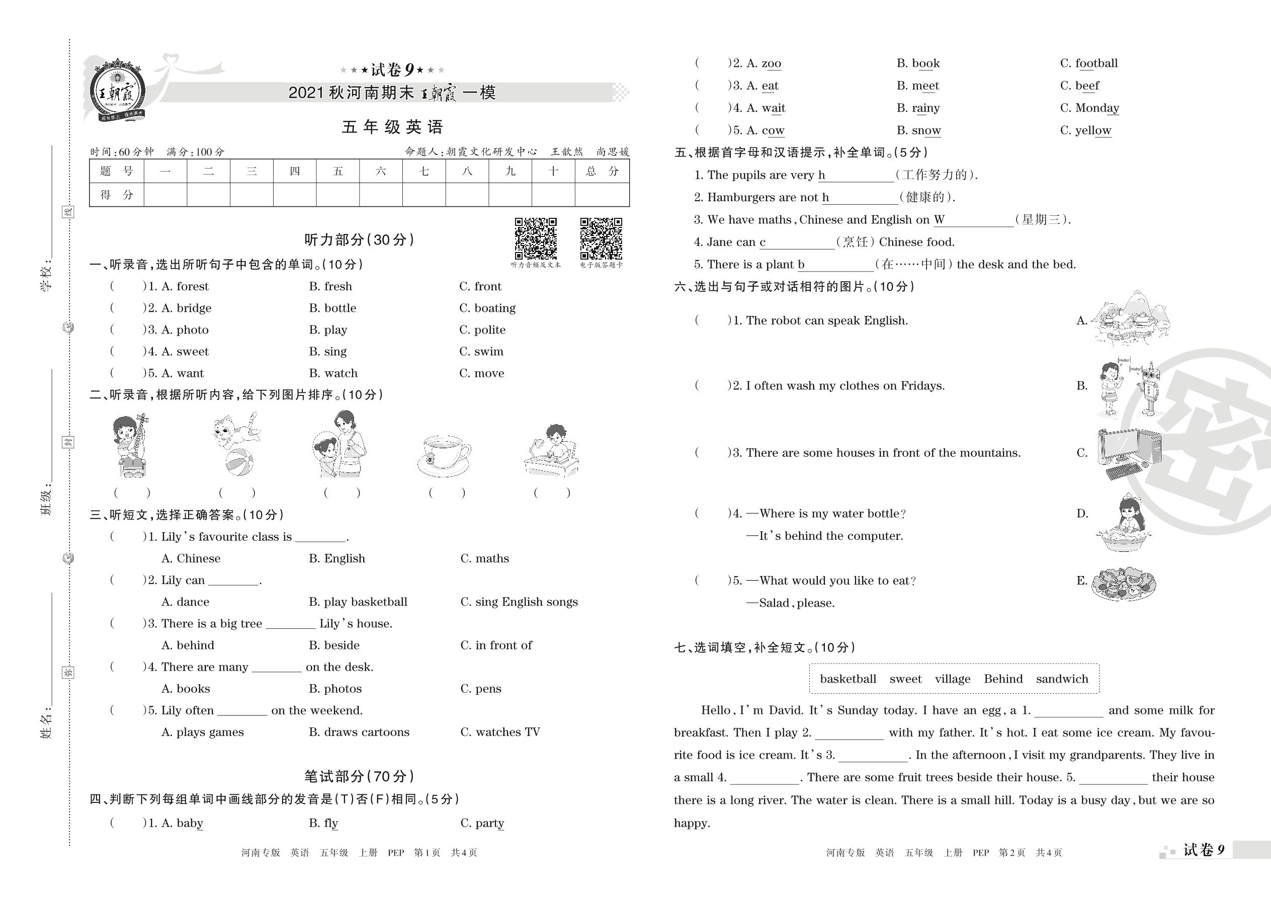 王朝霞期末模拟卷五年级上册英语(人教PEP版)_R211224151734567【9】