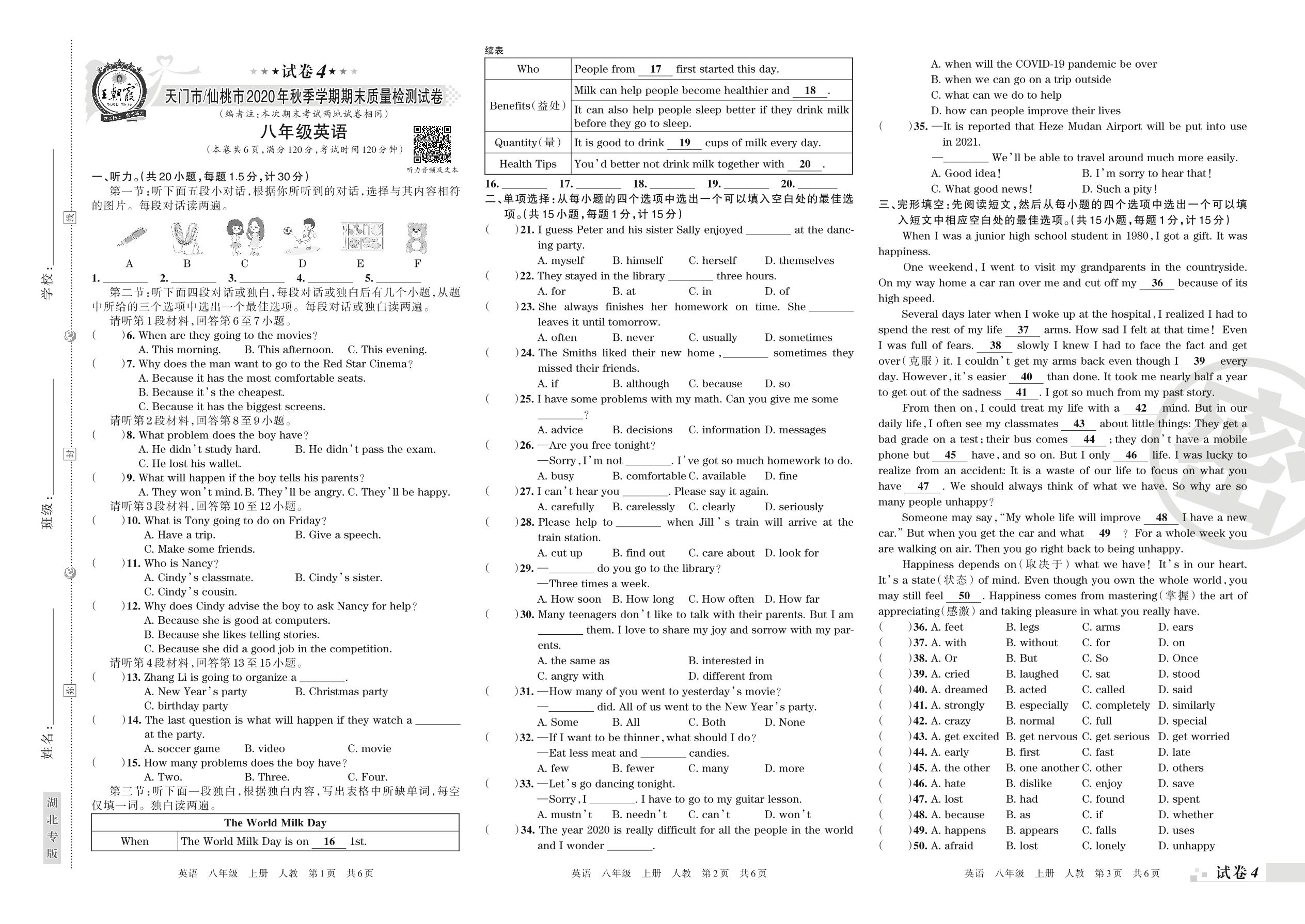 天门市、仙桃市2020年秋季学期期末质量检测试卷八年级英语(人教版)【4】