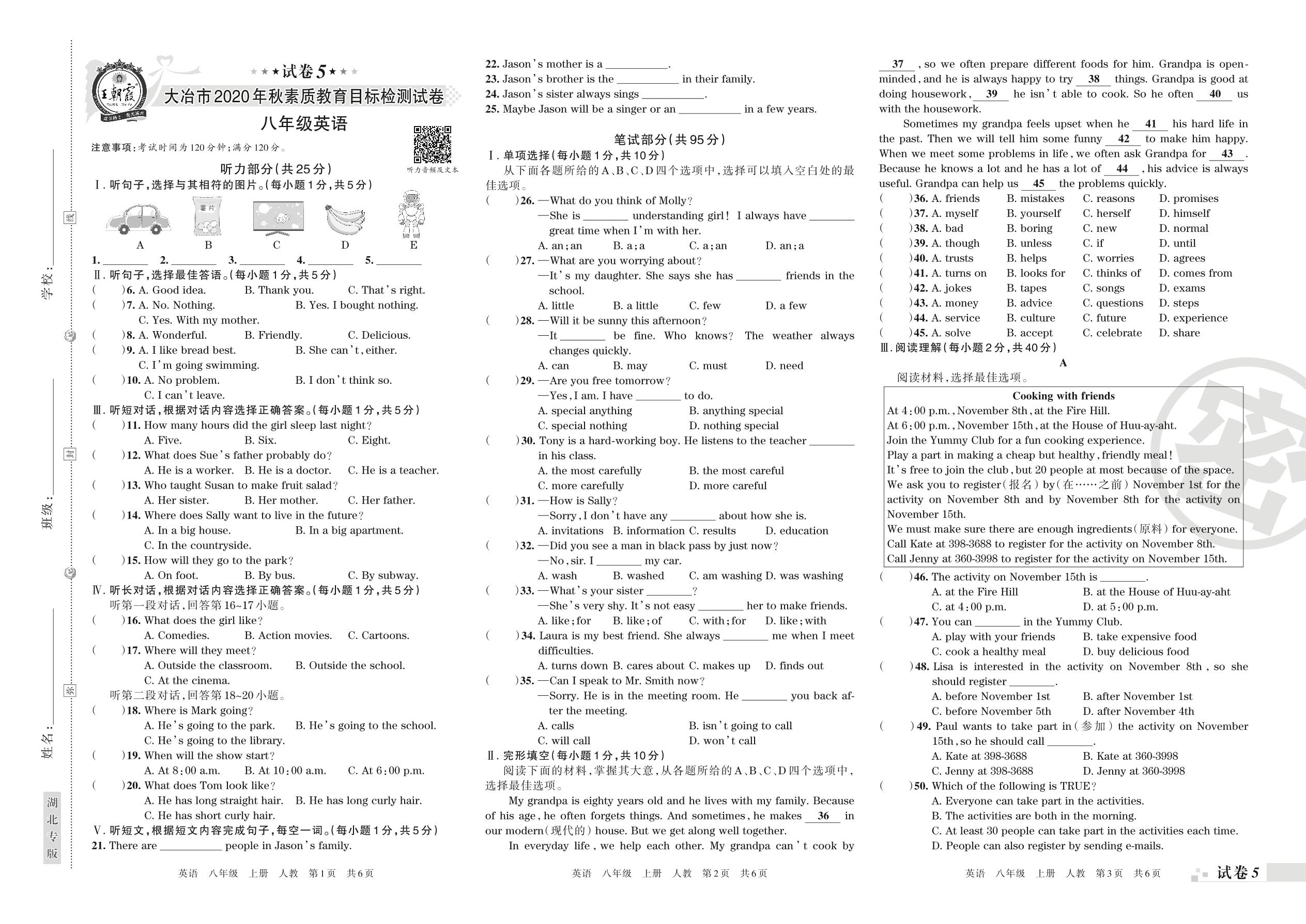 大冶市2020年秋素质教育目标检测试卷八年级英语(人教版)【5】