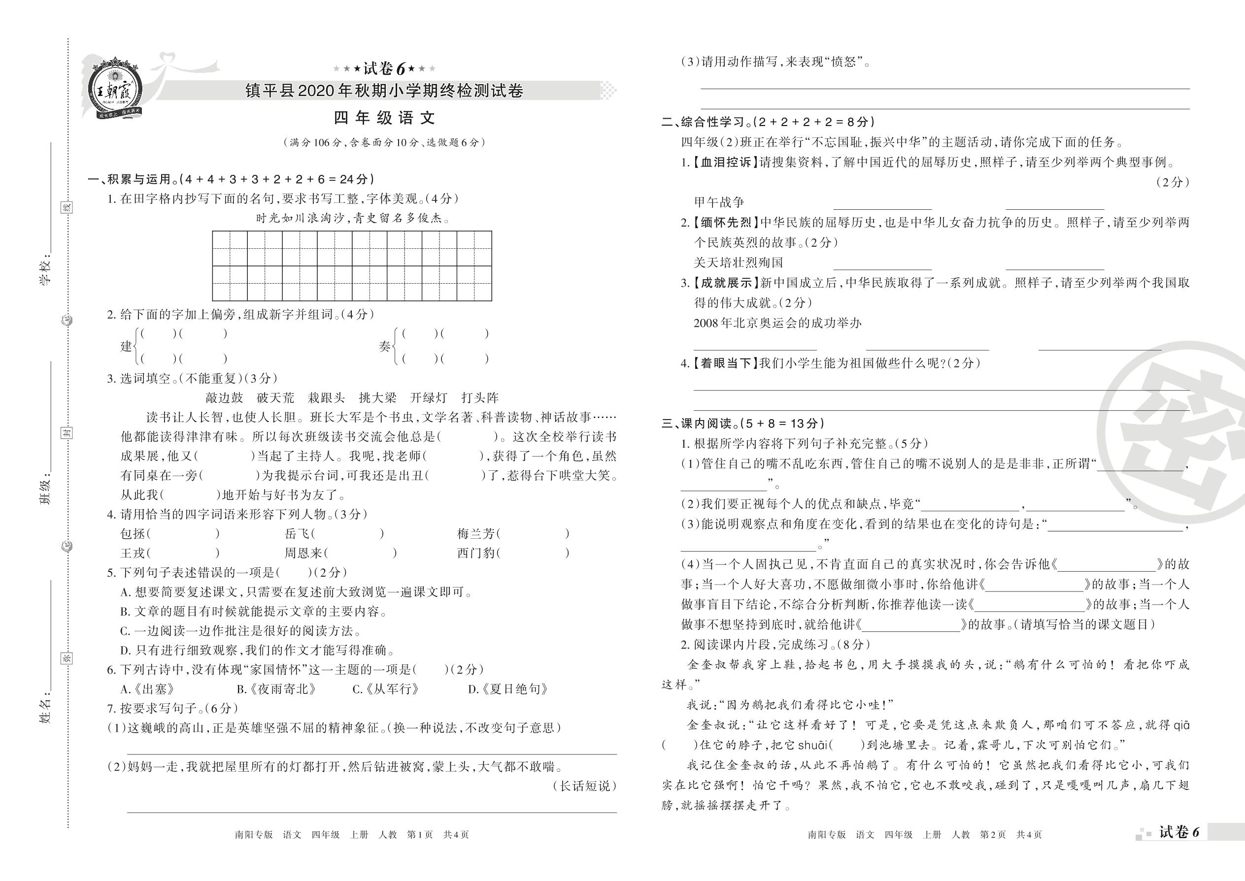 镇平县2020年秋期小学期终检测试卷四年级语文(人教版)【6】