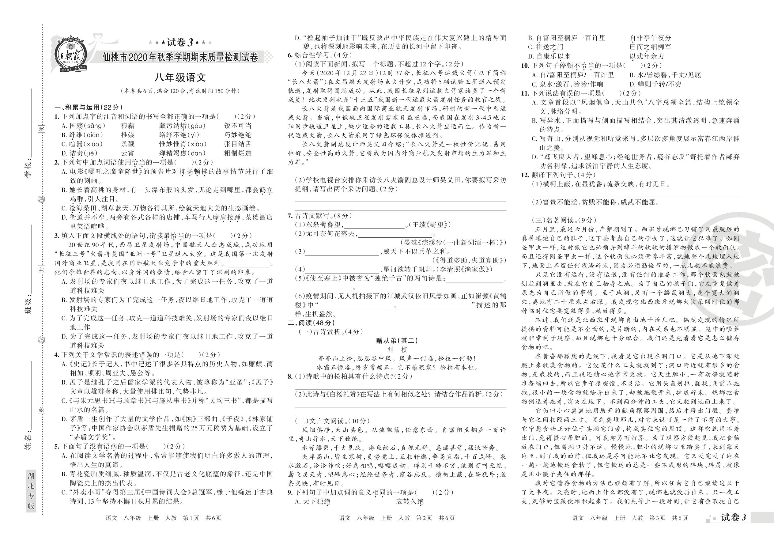 仙桃市2020年秋季学期期末质量检测试卷八年级语文(人教版)【3】