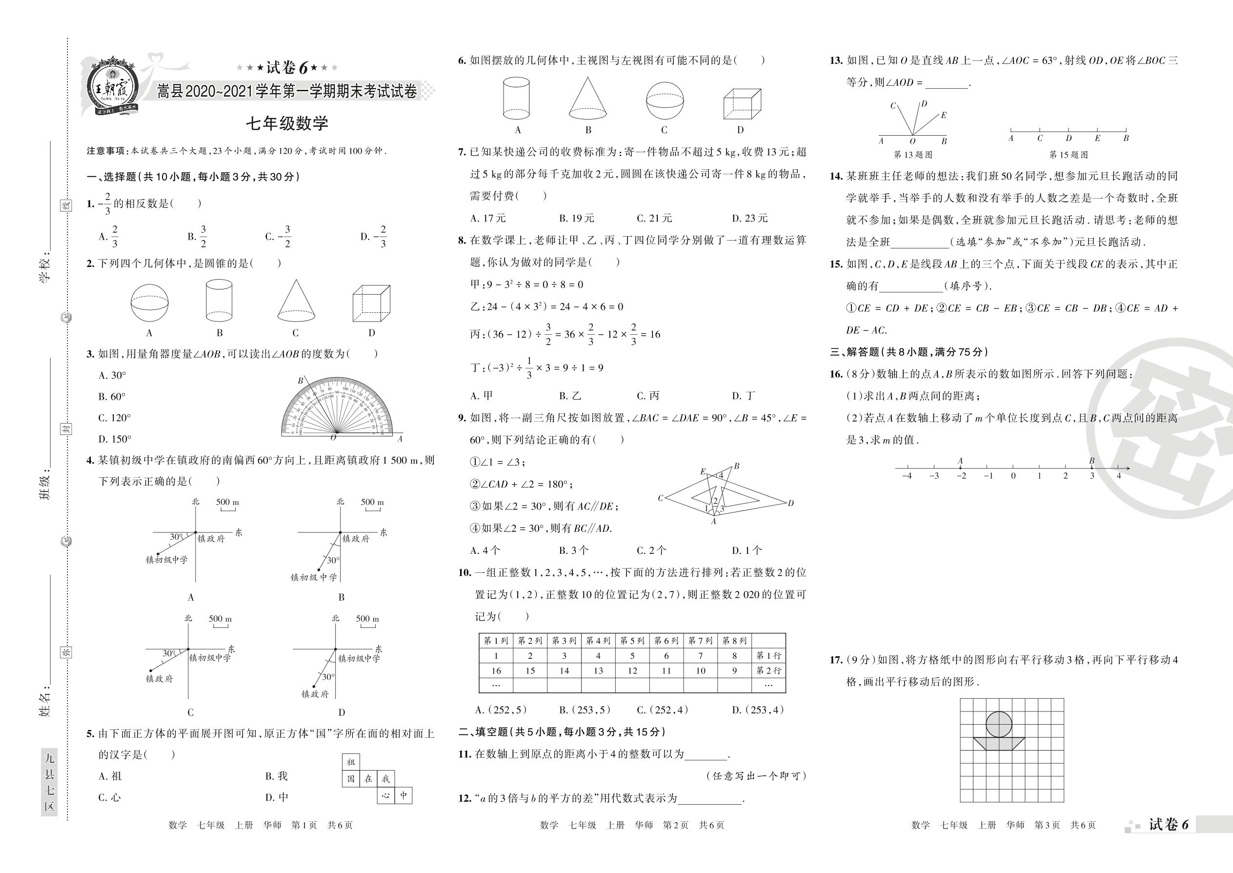 嵩县2020~2021学年第一学期期末考试试卷七年级数学(华师版)【6】