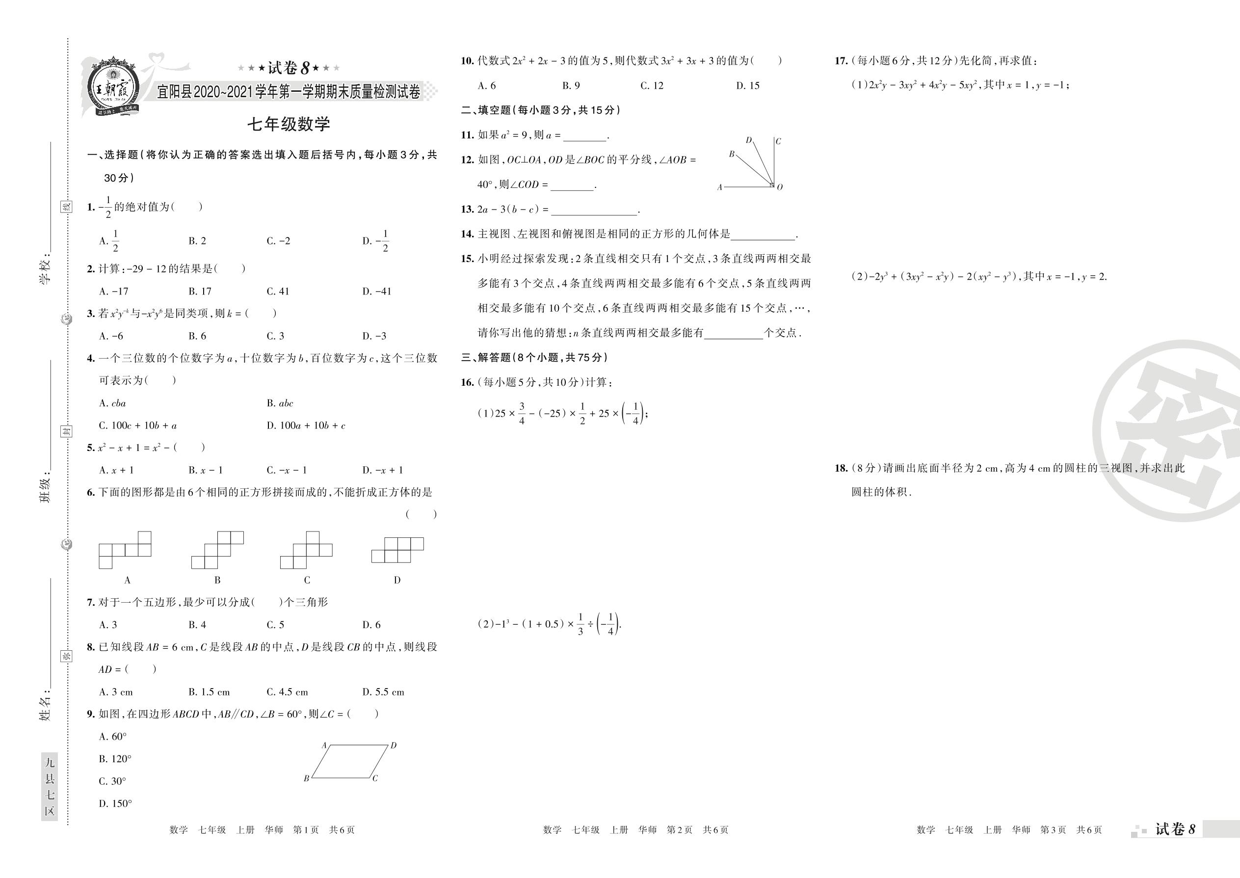 宜阳县2020~2021学年第一学期期末质量检测试卷七年级数学(华师版)【8】